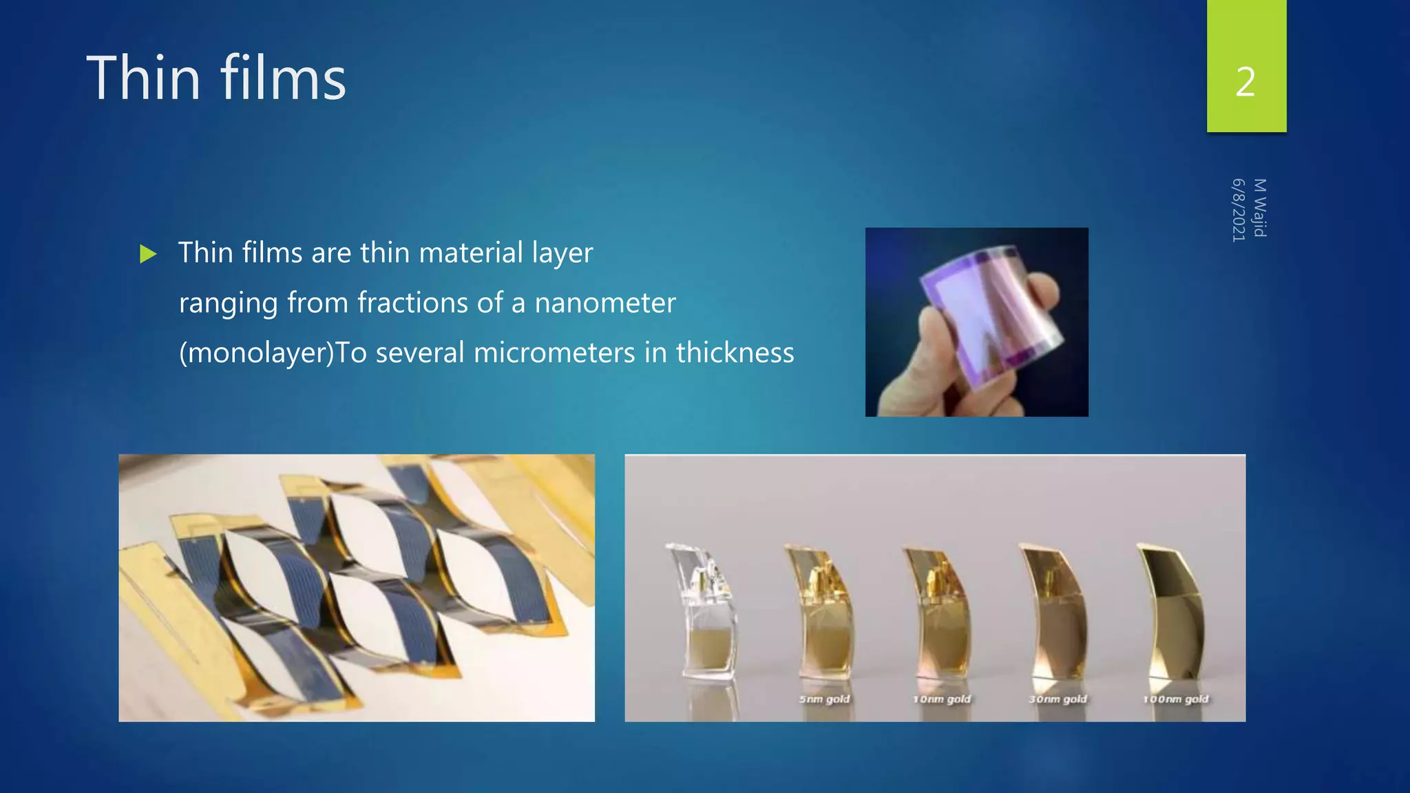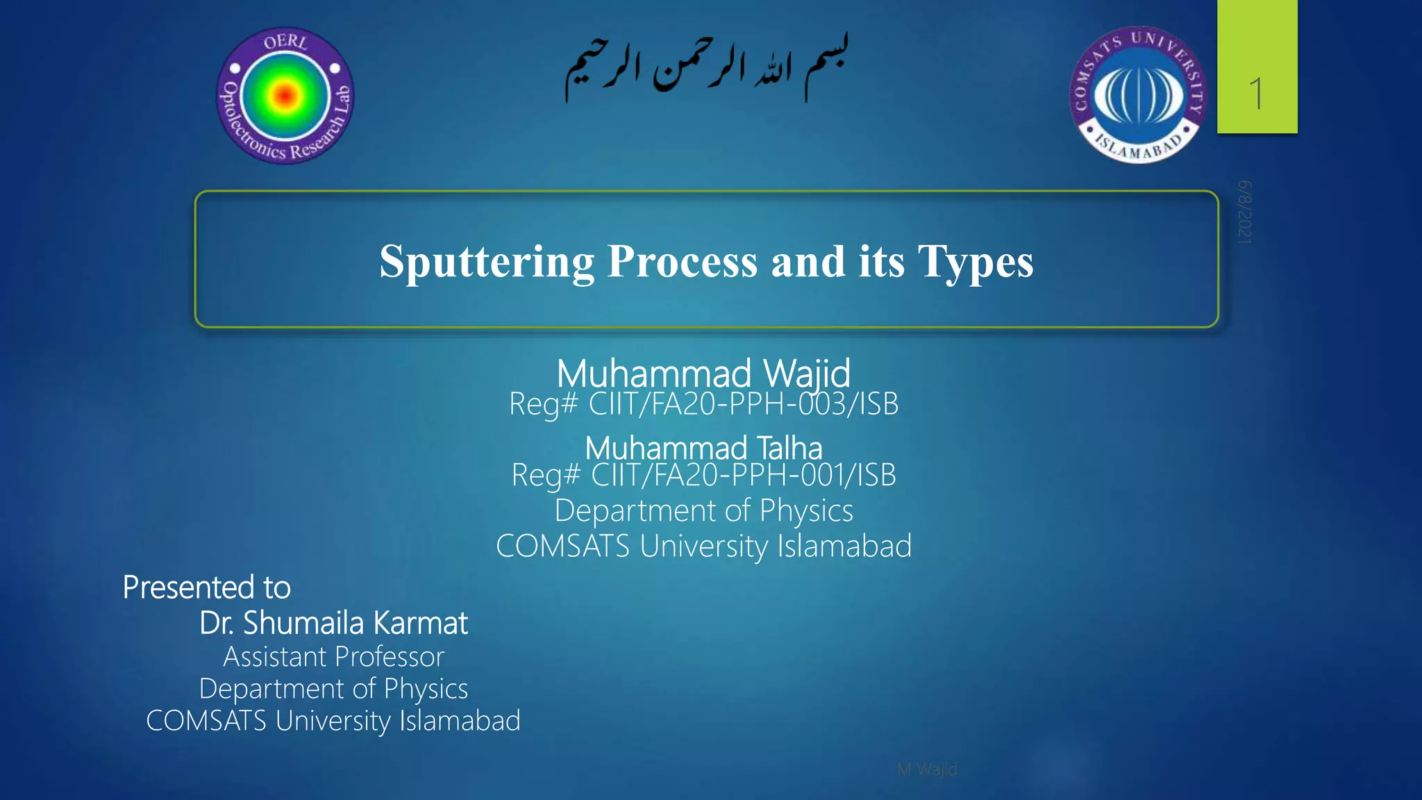 Muhammad Wajid and Muhammad Talha presented a report on sputtering process and its types to Dr. Shumaila Karmat. Sputtering is a process where atoms are ejected from a material's surface when struck by energetic particles, and it was first discovered in 1852. There are several types of sputtering including magnetron sputtering, ion-beam sputtering, and reactive sputtering. Magnetron sputtering traps electrons near the target using electric and magnetic fields to increase the deposition rate. Ion-beam sputtering uses a focused ion beam to sputter the target. Reactive sputtering introduces a reactive gas to deposit a film with a different composition than the target through a chemical reaction.