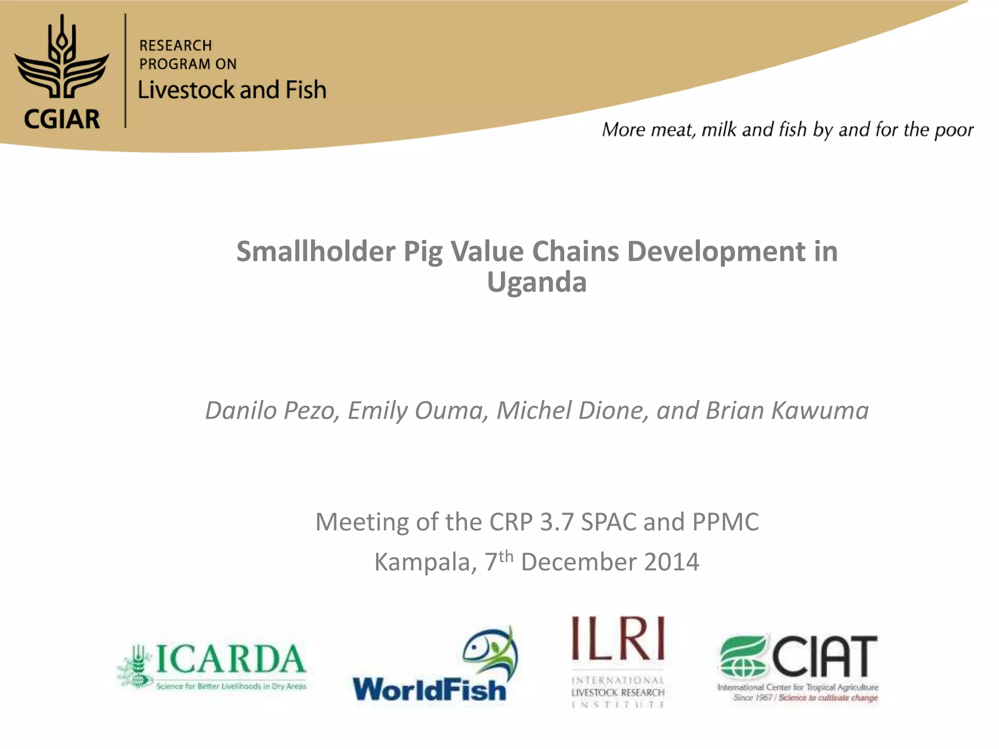 Pig production in Uganda is growing, with the pig population increasing significantly over the past 30 years, but the sector remains underdeveloped and informal, lacking organization and processing capabilities. Smallholder pig farmers face challenges including limited access to financial services, fair pricing, and government support, while partnerships with various stakeholders aim to enhance the value chain and improve livelihoods. The goal is to transform subsistence-level pig farming into a more competitive business through better productivity, market access, and waste management practices.