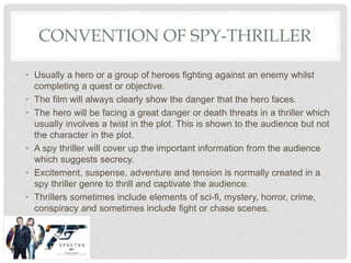 This document discusses key conventions of spy thriller films including having a hero facing danger and death threats while completing an objective against an enemy. It also notes that spy thrillers create excitement and suspense through elements like secrecy, adventure, tension, and sometimes include fight or chase scenes. Additionally, it outlines how sound, editing, setting, and lighting are used to build tension and atmosphere, such as using fast-paced music and action scenes or setting stories in dark, mysterious places.