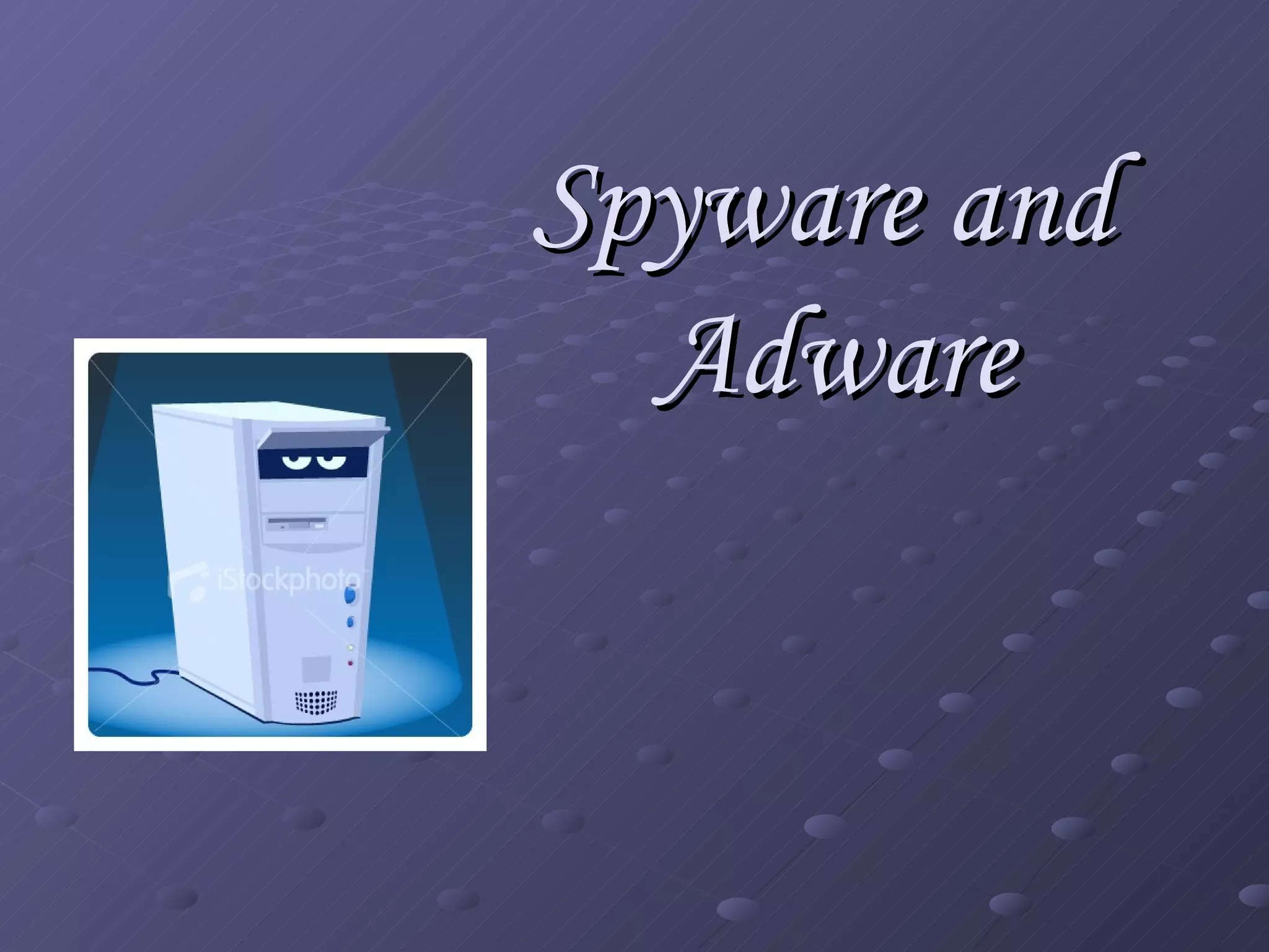 Spyware and adware are types of software that can be installed secretly on a computer to collect personal information or display advertisements. Spyware tracks users' browsing habits and other computer activities, while adware automatically displays ads. Both can slow computers and redirect browsers. Common symptoms of spyware/adware infections include frequent popups and a changed homepage. Programs like Ad-Aware, Spybot Search & Destroy, and Spy Sweeper can help detect and remove these programs. Users should avoid unnecessary downloads and popups to prevent infections.
