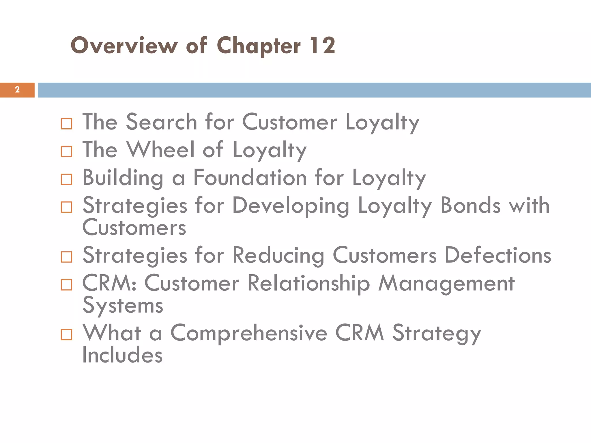 This document provides an overview and summary of key topics from Chapter 12 of the marketing textbook, including managing customer relationships and building loyalty. It discusses the importance of customer loyalty for a firm's profitability, strategies for developing loyalty bonds like deepening relationships, implementing reward programs, fostering social bonds, and offering customization. Graphs and figures are referenced to explain concepts such as the customer satisfaction-loyalty relationship, measuring customer lifetime value, and effective customer tiering. Case studies from companies like Harrah's and British Airways are also mentioned.