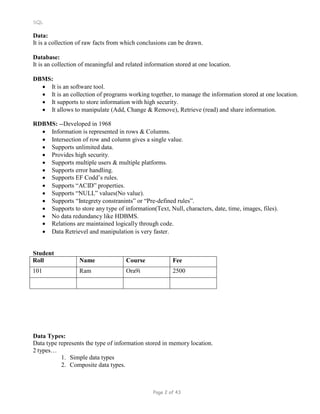 The document provides a comprehensive overview of SQL, including its structure, data types, and various sub-languages such as DDL, DML, DQL, DCL, and TCL. It discusses database management systems, particularly RDBMS, emphasizing their functionality, data integrity features, and command syntax for manipulating and querying data. Additionally, it explains concepts like null values, operators, system tables, and built-in functions used in Oracle SQL.
