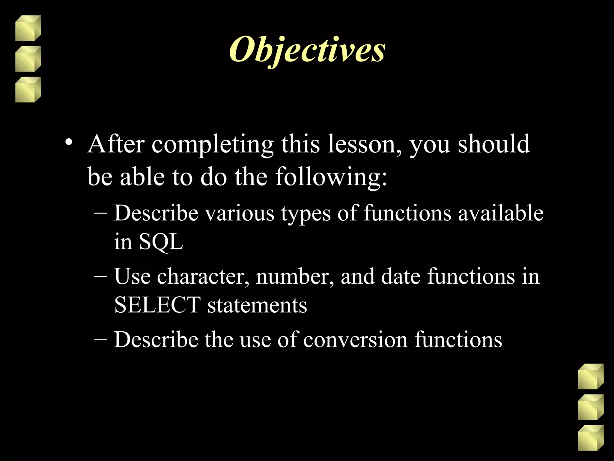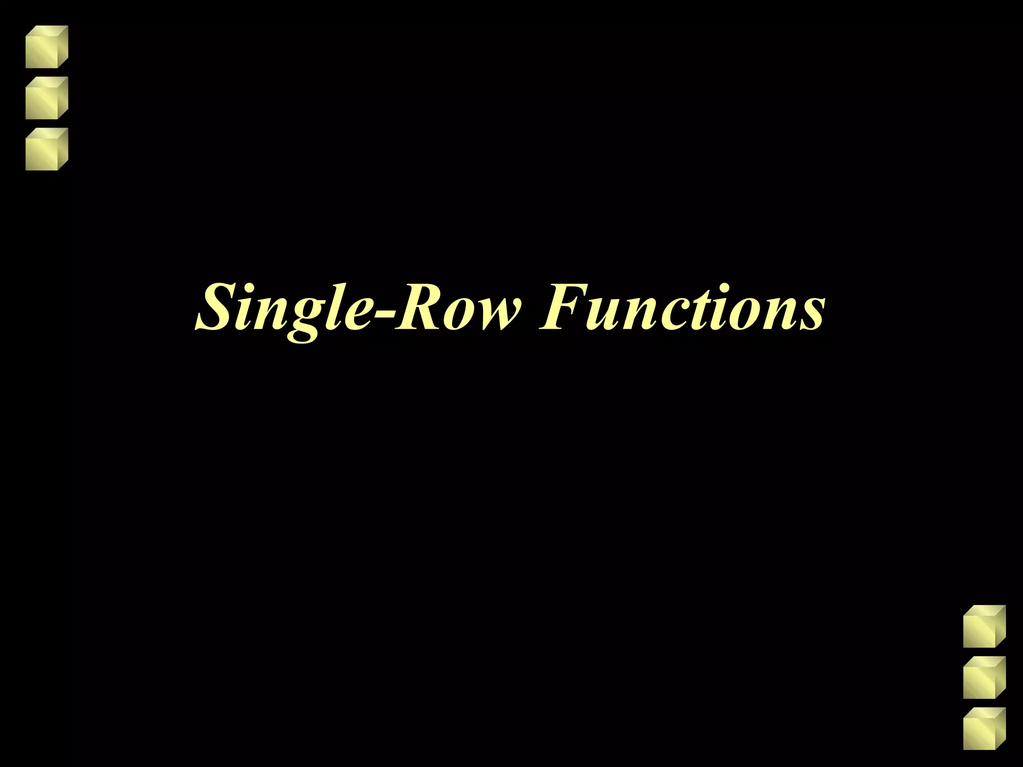 Single-row functions allow users to manipulate data within SQL queries. Common types include character, number, date, and conversion functions. Character functions modify strings, number functions perform calculations, date functions work with dates, and conversion functions change data types. Functions are useful for formatting output, performing calculations on individual rows, and conditional processing.