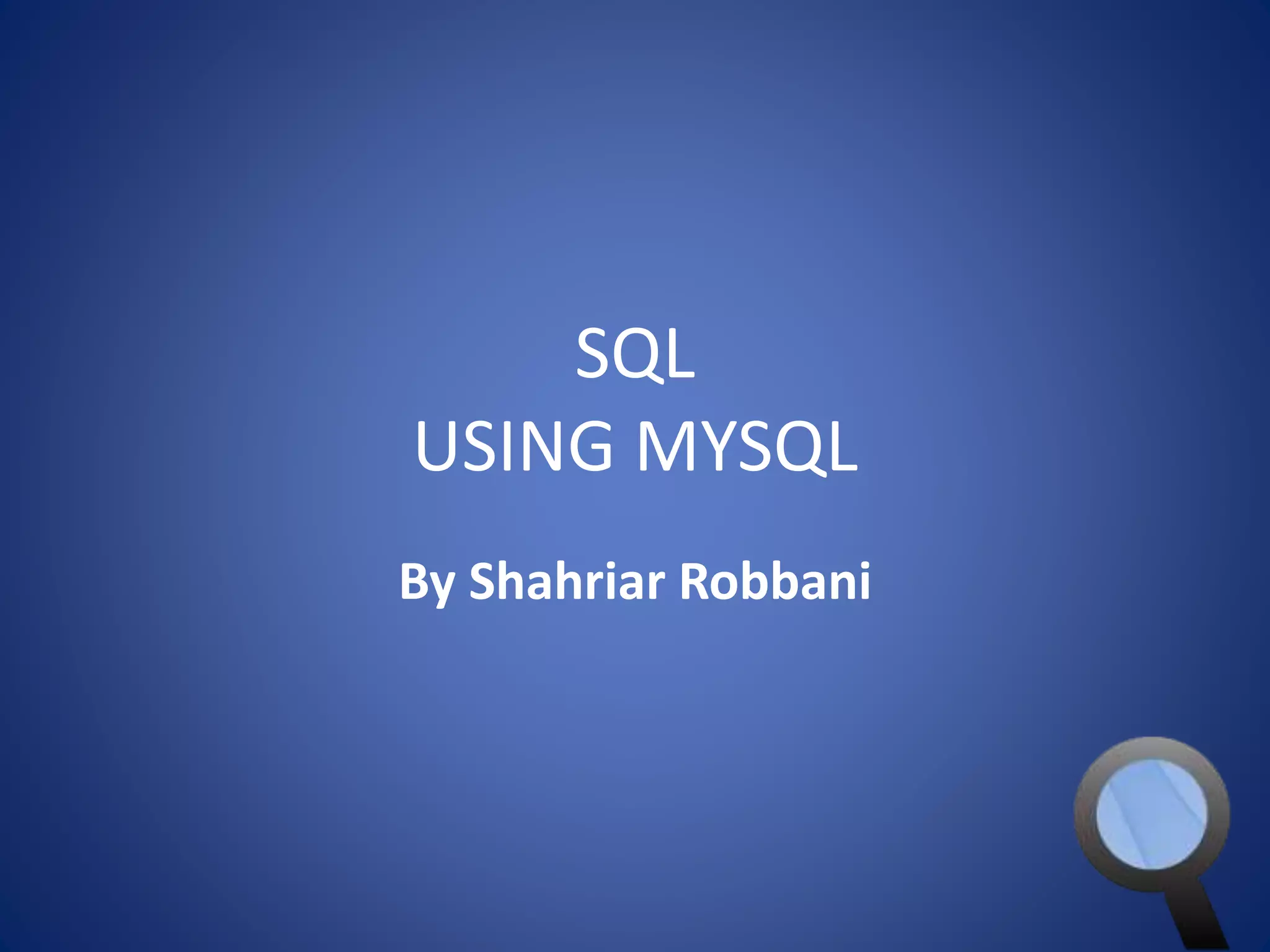This document provides an overview of SQL and MySQL. It discusses topics such as creating and deleting databases and tables, importing data, using IDEs like Execute Query, configuring connections, performing queries with SELECT statements including filters, joins, and aggregates, updating and deleting data, indexing, and working with dates, strings, and numbers. Examples of SQL queries are provided throughout to demonstrate different SQL syntax and functions.