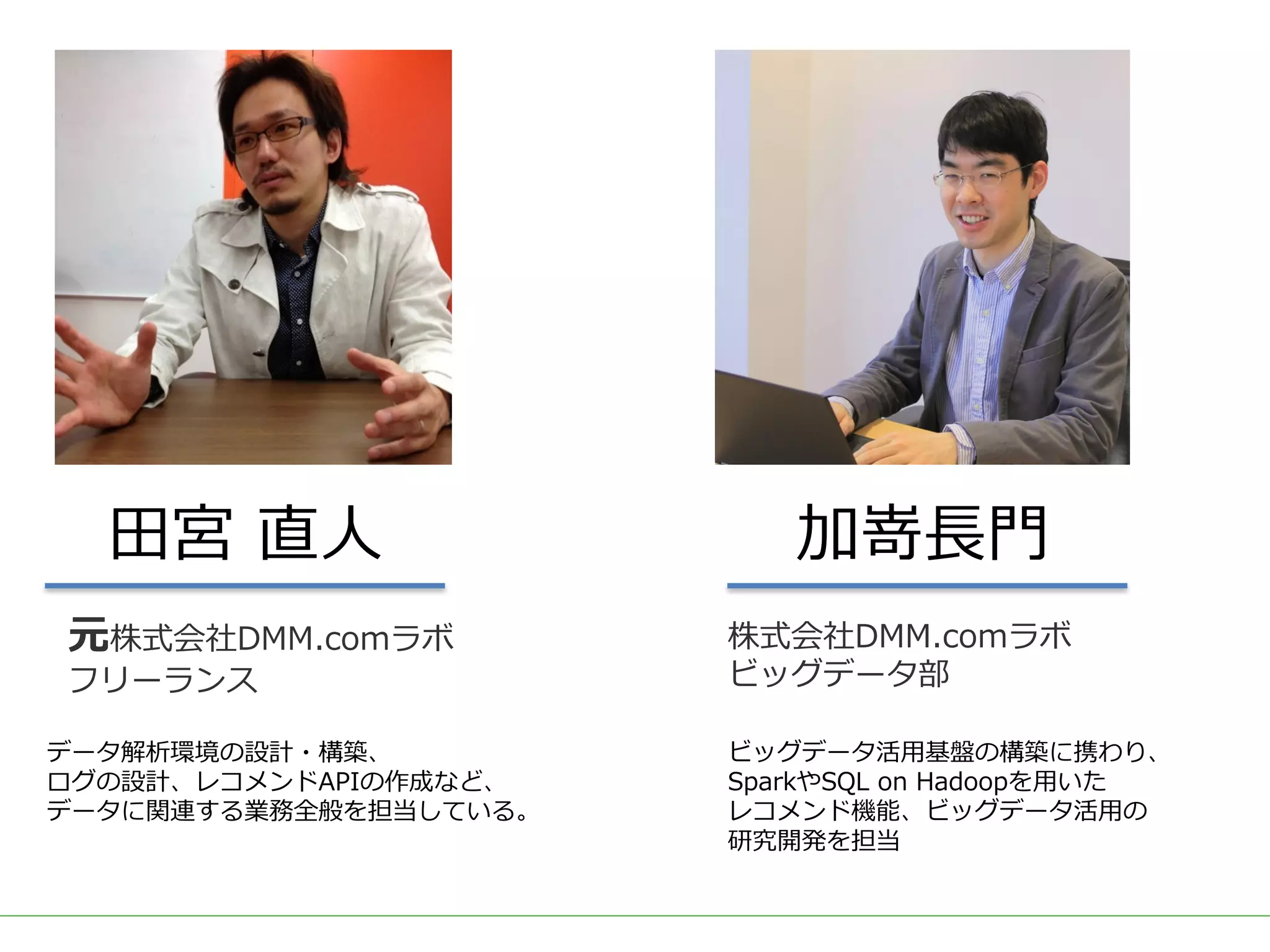 DMM.comラボでも、2015年のビッグデータ部立ち上げ後、Hadoop/Sparkを用いた内製レコメンドの導入を続け、2017年3月には400を越える箇所(Webページ、メルマガ等)で利用されています。