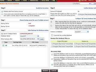StoreGrid is an automated SQL Server backup solution that allows scheduling backups to occur at exact times. It can compress, encrypt, and transfer backed up data to remote servers, unlike SQL Enterprise Manager. StoreGrid supports full, differential, and transaction log backups using either a basic or advanced plugin. Restoring databases with the advanced plugin is a two step process involving selecting the appropriate backups on the backup server and then configuring the database restore settings.