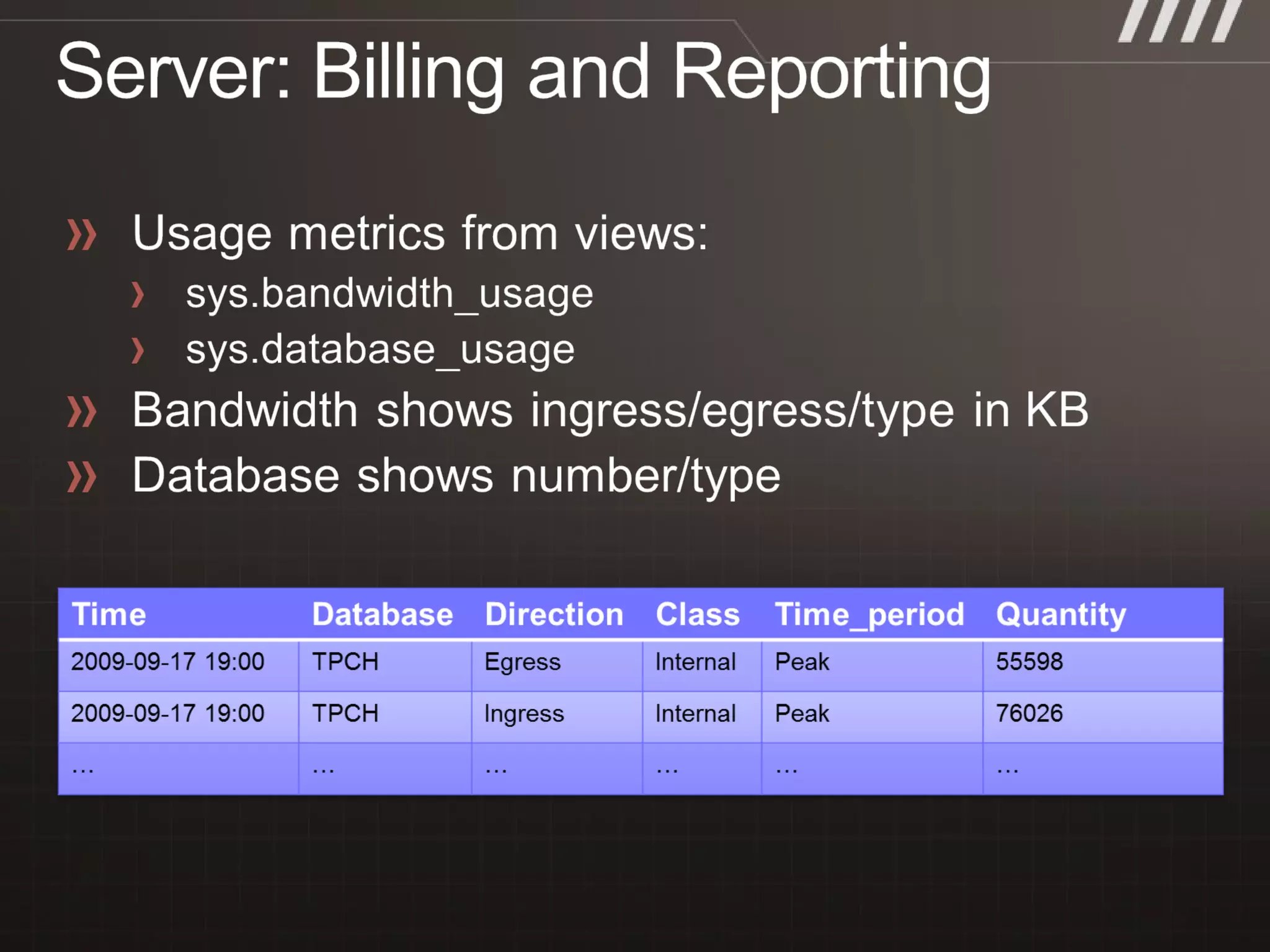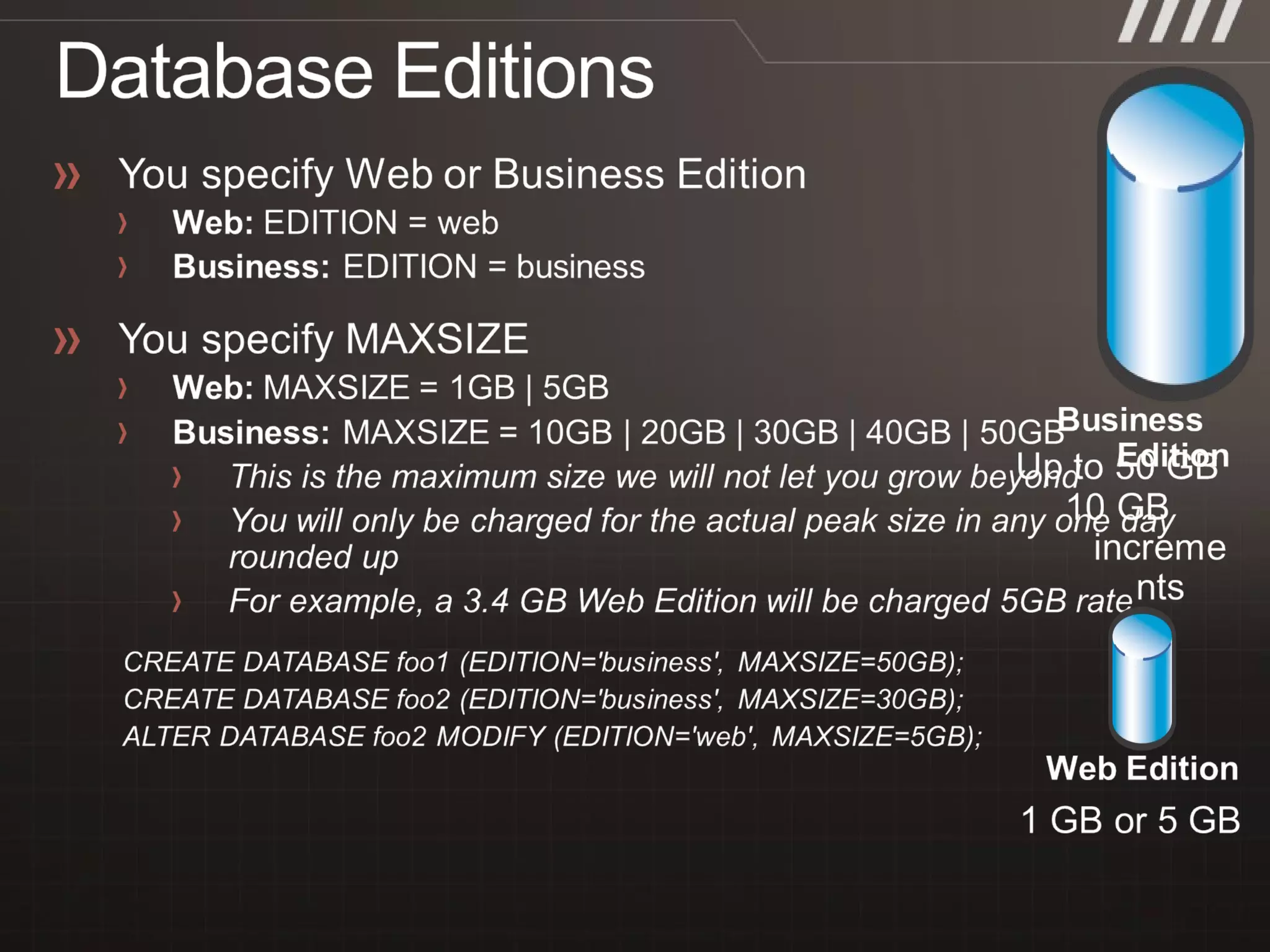 • #12 Slide Objective Provide information on the two SQl Azure editions Speaker Notes Not prorated by size Pro rated by the day or part thereof by midnight UTC- charged for peak size that day Can move up and down between sizes SQL Azure has no query charge Excessively long transactions or high query load may result in throttling Traffic as per other Windows Azure Platform Services
