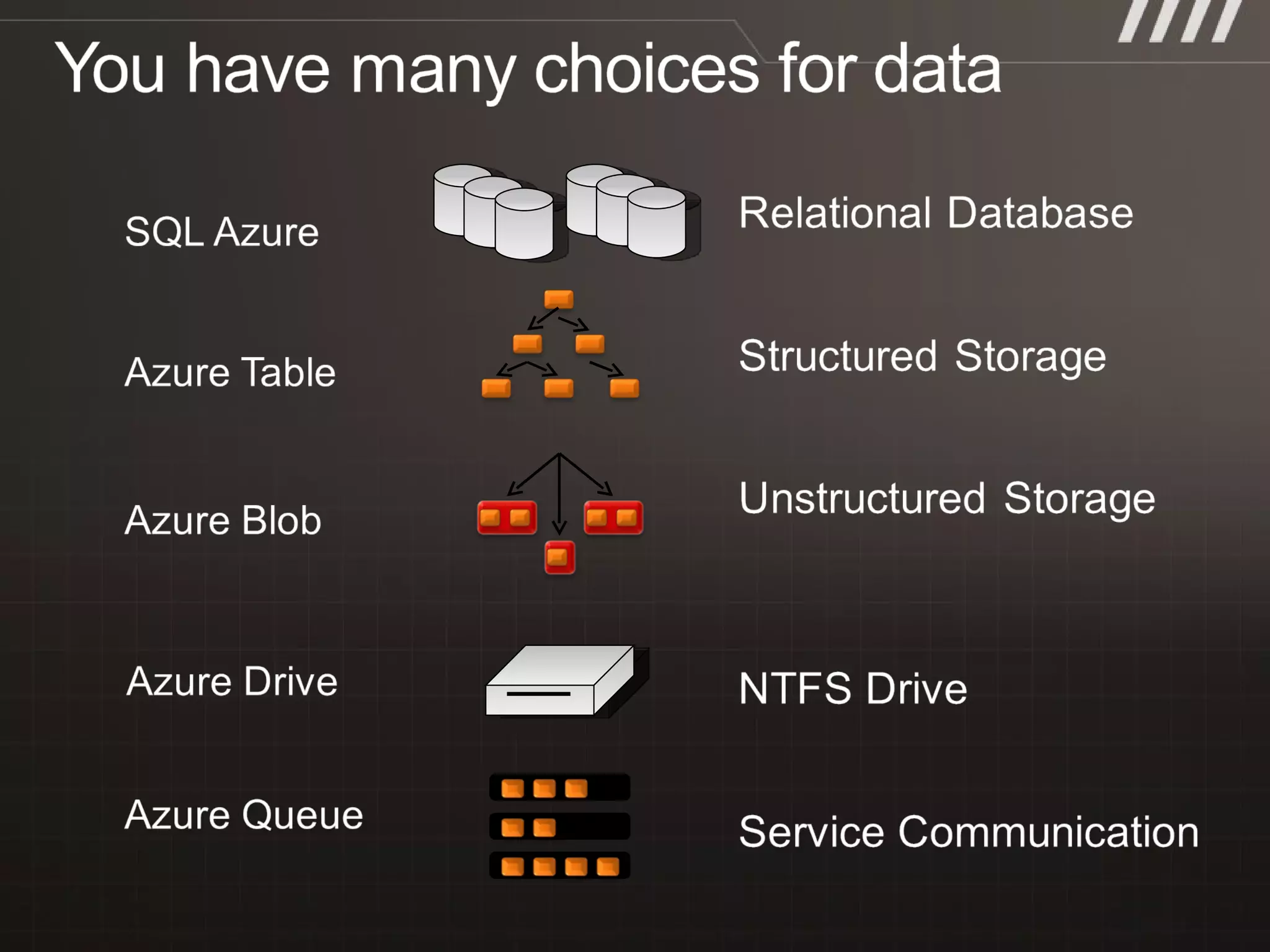 Single Blob Drive Queue Table Single SQL Azure Database Structured Data Y Y Relational Database Y Server Side Processing Y Direct Access from outside Azure Y Y Y Y Messaging Infrastructure Y Persistent Storage Y Y 1 week Y Y Size Limit 200 GB/ 1 TB 1 TB 100 TB 100 TB 50 GB (*)