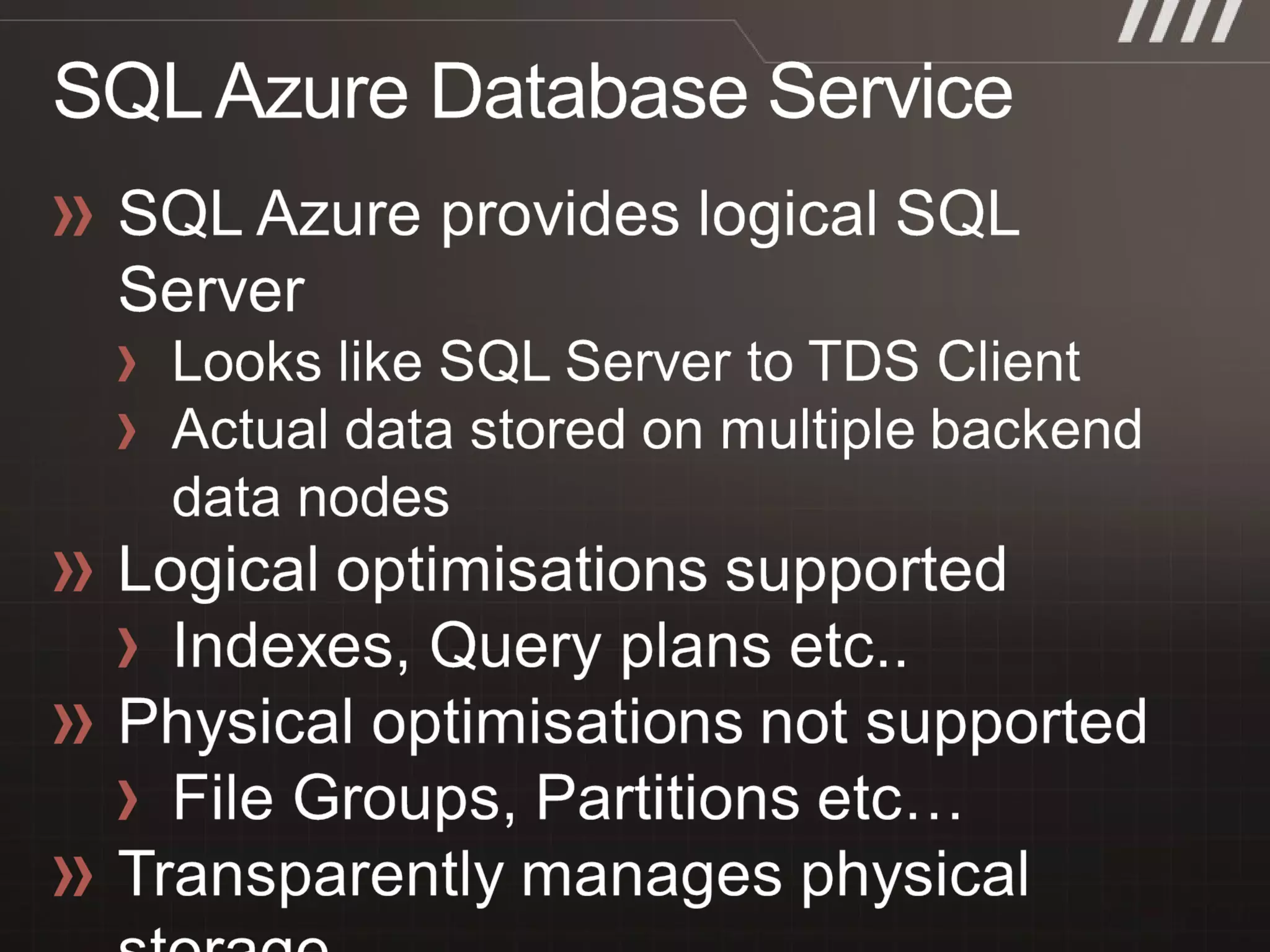 • #7 Slide Objective Explain the architecture of SQL Azure in a diagrammatic form Speaker Notes Access is via a load balancer- load balancer is a sticky (stateful) load balancer Gateway nodes appear to TDS client as a SQL Server, but, merely forward requests through to the underlying SQL servers that actually store the data Requests are routed to a primary replica- more on replicas shortly Shared infrastructure at SQL database and below Each user database is replicated to one or more servers (configurable based on SLA) Client requests are routed to current “primary server” for read and write operations (based on SQL session) Security, lockdown and isolation enforced in SQL tier Highly scalable and state-of-the-art HA technology Automatic failure detection; client request re-routed to new primary on failure High SLA guarantee using logical replication (hot standby replicas) Automatic management, self-healing and load balancing across shared resource pool SDS provides provisioning, metering and billing infrastructure Notes SQL Azure architecture http://msdn.microsoft.com/en-us/library/ee336271.aspx