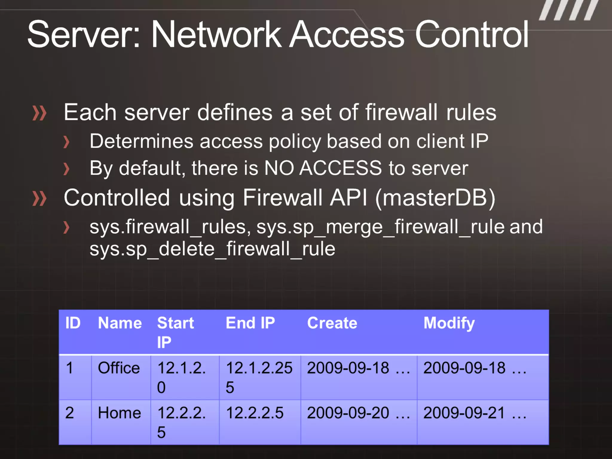 • #10 Slide Objective Provides detailed information on connecting to SQL Azure Speaker Notes SQL Azure uses the standard SQL connection string syntax Several important points Need to specify the database to connect- i.e. No USE DB option Set the initial catalog to do this Must enable encryption Traffic transits over the internet. Should not trust server certificate (i.e. override trust chain check0 More on security and encryption on Day 3 security session SQL Azure has a configurable firewall Must explicitly allow connectivity from address ranges Open the smallest ranges possible Will be times when you need to ‘allow all’ E.g. Datasync with mobile clients etc… Notes Connecting to SQL Azure step by step http://msdn.microsoft.com/en-us/library/ee336243.aspx SQL Azure Firewall http://msdn.microsoft.com/en-us/library/ee621782.aspx