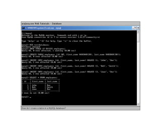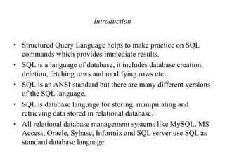 This document provides an extensive overview of Structured Query Language (SQL), detailing its functions, history, architecture, commands, and various types of operations. It explains the syntax for key SQL operations including data definition, manipulation, and queries, as well as constraints for managing data integrity. Additionally, it covers concepts such as data types, operators, joins, and aggregate functions, serving as a comprehensive guide for understanding and utilizing SQL in relational database management systems.