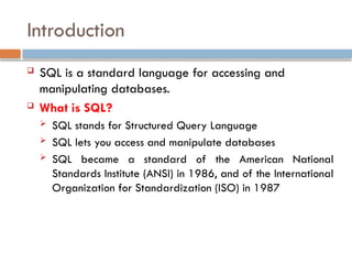 The document explains SQL, a standardized language for accessing and manipulating databases, detailing its functionalities, command types, and various SQL data types. It covers the categorized commands like DDL (Data Definition Language), DML (Data Manipulation Language), DCL (Data Control Language), and others with examples for each, focusing on how to create, alter, and manage databases and tables effectively. Additionally, it introduces constraints, indexing, views, and provides practical assignments to reinforce learning.