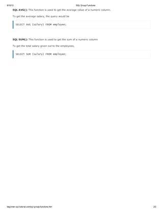 Group functions in SQL are built-in functions that operate on groups of rows and return one value for the entire group. The document describes several common group functions: COUNT counts the number of rows that meet certain criteria; MAX and MIN return the highest and lowest values in a column; AVG calculates the average of numeric values; SUM adds up the values in a column; and DISTINCT eliminates duplicate rows. Examples are given showing how to use each function to analyze data from an employees table.