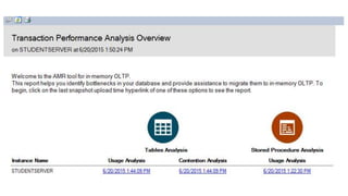 This document discusses in-memory database functionality in SQL Server including architecture, tables and indexes, stored procedures, restrictions, monitoring tools, concurrency control, and data management views. It covers creating in-memory enabled databases, table types, index types, updating statistics, and natively compiled stored procedures. The document also mentions analyzing, migrating, and reporting tools for reviewing in-memory databases.