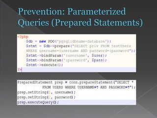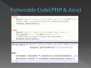This document discusses SQL injection attacks and how to prevent them. It describes different types of SQL injection like blind SQL injection and union-based injection. It provides examples of vulnerable code and how attackers can exploit it. Finally, it recommends best practices for prevention, including using parameterized queries, stored procedures, input validation, and secure configuration.