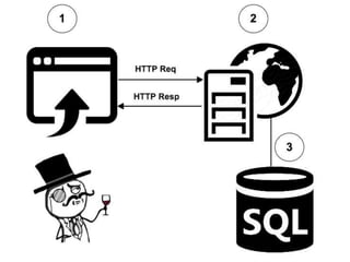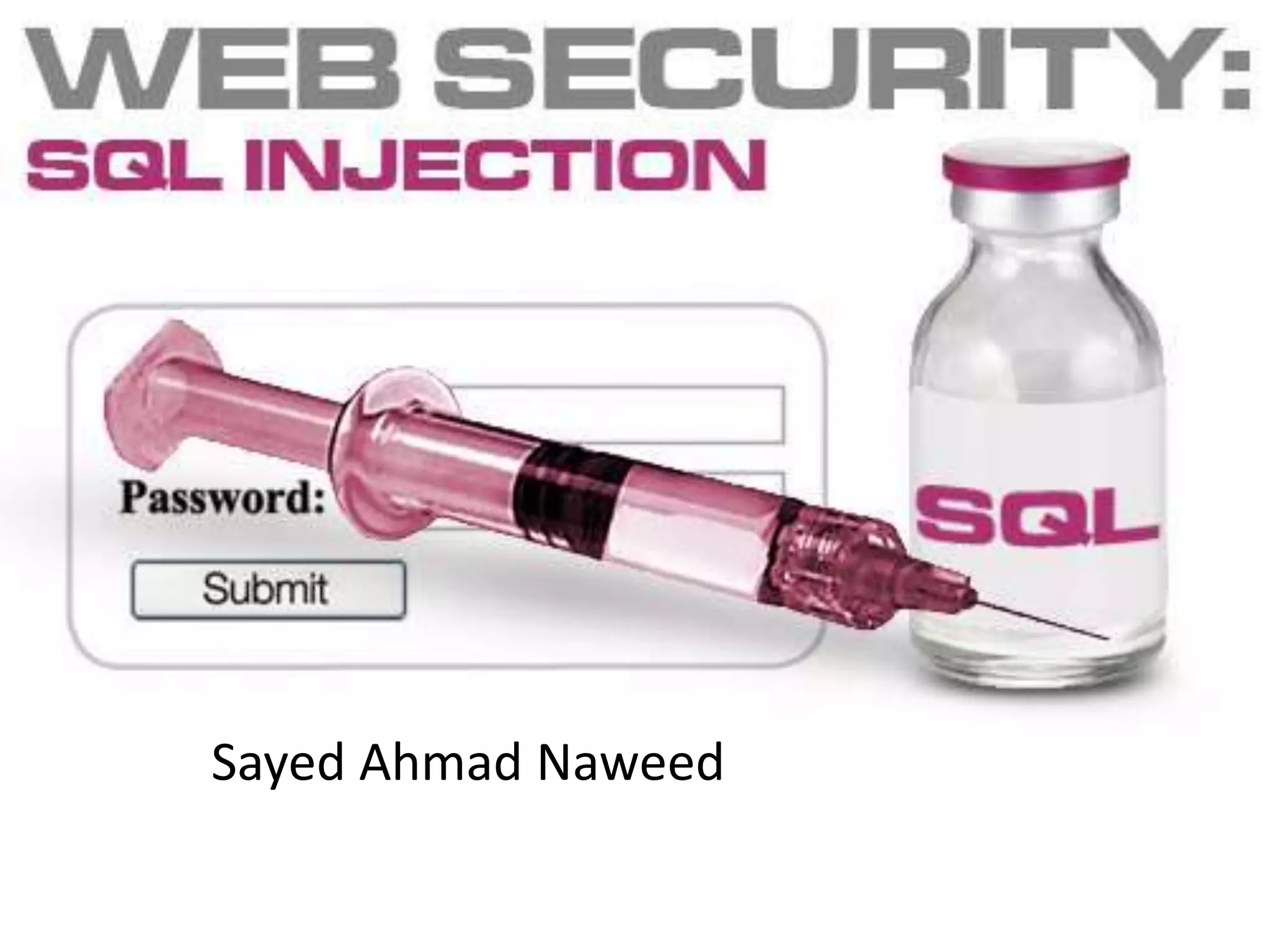 According to a 2015 study, 86% of over 30,000 websites tested had at least one serious vulnerability. Of the vulnerabilities found, 61% were resolved within 193 days. SQL injection is a type of attack where an attacker tries to alter SQL statements by inserting new SQL keywords or operators. Examples provided demonstrate how an attacker can use SQL injection to drop all databases or return all records. Prevention techniques like escaping characters and using prepared statements can help protect against SQL injection attacks.