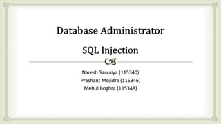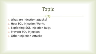 SQL injection is a common web application security vulnerability that allows attackers to control an application's database by tricking the application into sending unexpected SQL commands to the database. It works by submitting malicious SQL code as input, which gets executed by the database since the application concatenates user input directly into SQL queries. The key to preventing SQL injection is using prepared statements with bound parameters instead of building SQL queries through string concatenation. This separates the SQL statement from any user-supplied input that could contain malicious code.