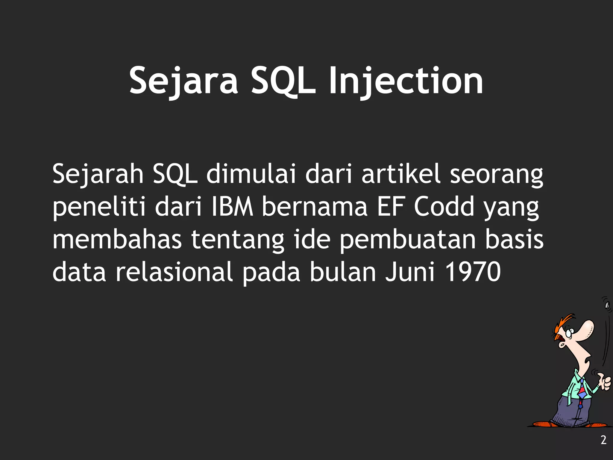 Dokumen tersebut membahas tentang SQL injection, termasuk sejarah SQL, metode SQL injection seperti UNION based dan string based, fungsi SQL injection seperti menambah data dan melewati otentikasi, serta tools yang digunakan seperti SQLMap dan perangkat keras seperti komputer dan jaringan."