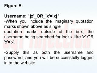 This document discusses SQL injection, including what it is, how it works, and how to prevent it. It provides examples of different types of SQL injection attacks, walking through the steps to obtain sensitive information like usernames and passwords from a database. The document also discusses how to alter data in a database using SQL injection. Finally, it discusses some defenses and countermeasures like implementing error handling, restricting database permissions, and input validation to prevent SQL injection attacks.