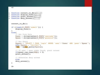 This presentation introduces SQL injection, a code injection technique that exploits security vulnerabilities in user input handlers to target databases. It provides examples of real-world SQL injection attacks, such as the theft of 130 million credit card numbers. The presentation demonstrates how SQL comments, logic statements, and multiple statements can be abused to perform unauthorized actions like dropping tables or updating passwords. It recommends server-side validation of user input and limiting database access to help prevent SQL injection attacks.
