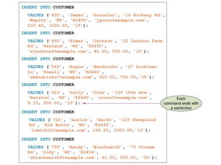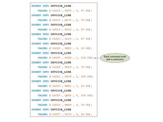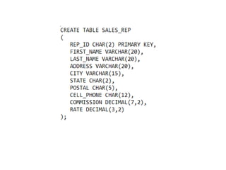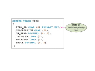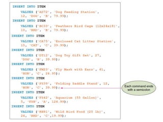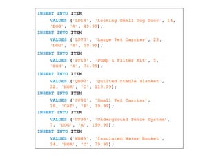 This document discusses database design concepts including entities, attributes, relationships, functional dependencies, and normalization. It provides examples of how to model a relational database for a pet supplies company using tables, columns, primary keys, and relationships. The document explains how to design a database by identifying entities, attributes, and relationships based on given requirements and mapping them to tables and columns.
