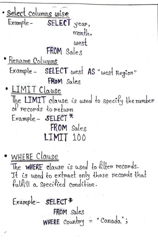 - Common SQL statements include SELECT, INSERT, UPDATE, DELETE, and basic clauses like WHERE, GROUP BY, ORDER BY, LIMIT.