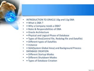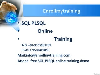 This document provides an overview of the topics covered in Enrollmytraining's free online SQL PLSQL training demo, including introductions to Oracle architecture, database creation, tablespace management, storage parameters, user management, undo management, networking, backups, performance tuning, auditing, and flashback features. The training demo can be attended online and contact information is provided for Enrollmytraining in India and the USA.