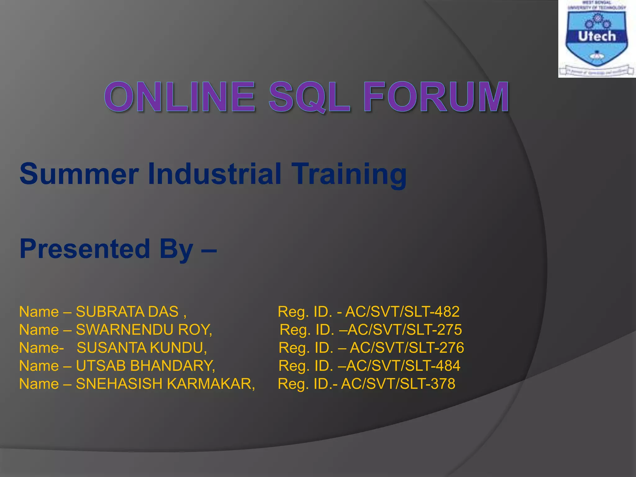 This document describes a summer industrial training project to develop an online SQL forum. It includes sections on functional and system requirements, hardware and software specifications, data modeling diagrams, use cases, screen shots, testing approaches, future enhancements, and references. A group of students developed the online application to allow users to ask and answer SQL questions, with an admin able to moderate content.