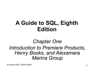 The document summarizes the database requirements for three example companies - Premiere Products, Henry Books, and Alexamara Marina Group - that are used in examples throughout the textbook. For each company, it lists the key data tables needed such as sales reps, customers, and orders for Premiere Products; branches, books, and inventory for Henry Books; and marinas, boat owners, and boat slips for Alexamara Marina Group. Sample data is also shown from tables for each company's database to illustrate the structure and content.