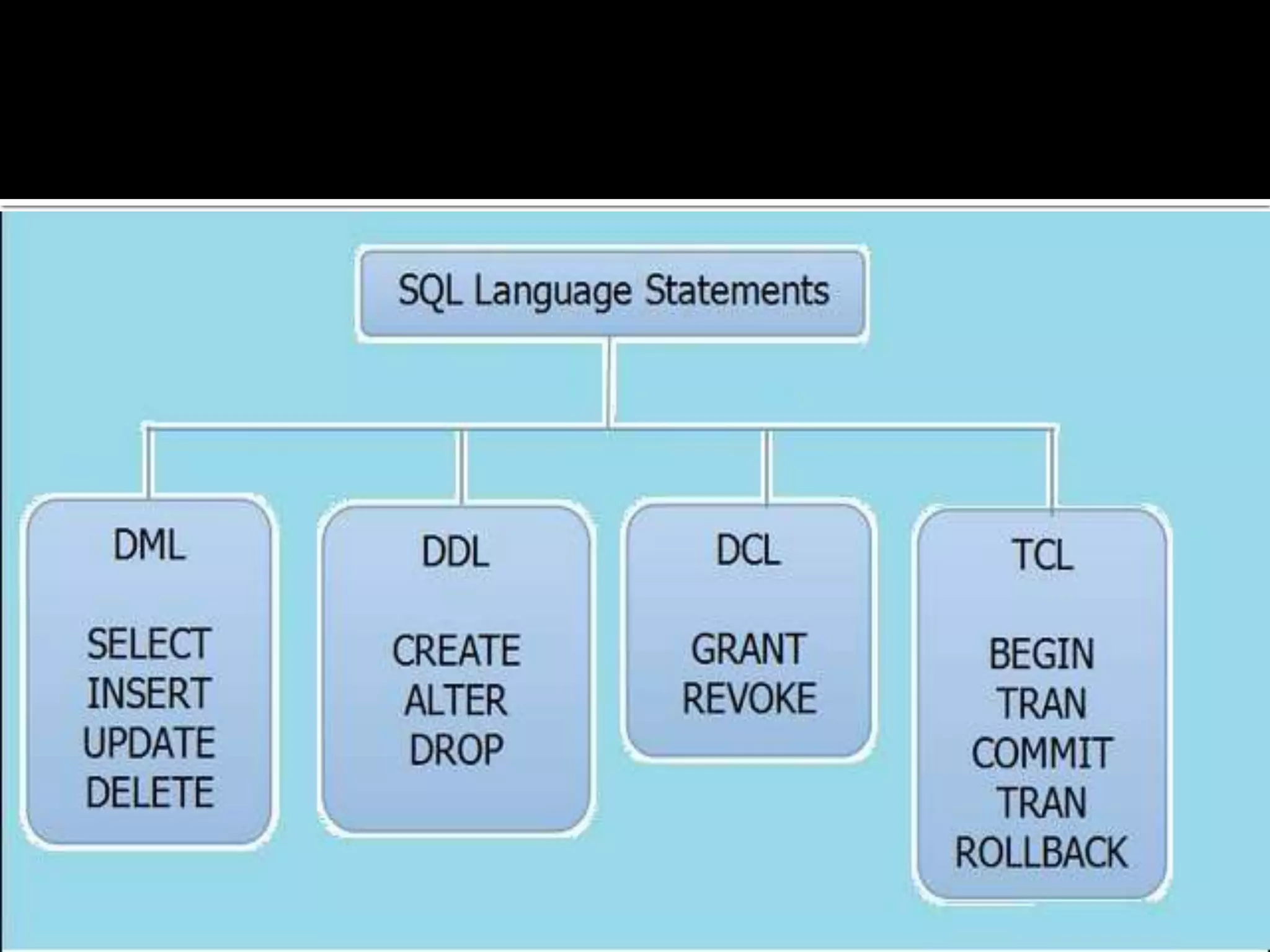 The document outlines the four primary SQL language types: DML (Data Manipulation Language), DDL (Data Definition Language), DCL (Data Control Language), and TCL (Transaction Control Language). It describes the functions of each category, including data manipulation through DML, structure definition with DDL, access control via DCL, and transaction management by TCL. The document also details various SQL commands and their operations within these categories.