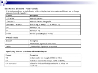 The document discusses various SQL statements and concepts. It introduces the different types of SQL statements - DQL, DML, DDL, TCL, DCL and describes common statements like SELECT, INSERT, UPDATE, DELETE. It also covers SQL concepts like data types, NULL values, joins, aggregation, sorting, filtering using WHERE clause and logical operators. Single-row functions for character, number and date manipulations are explained along with examples.