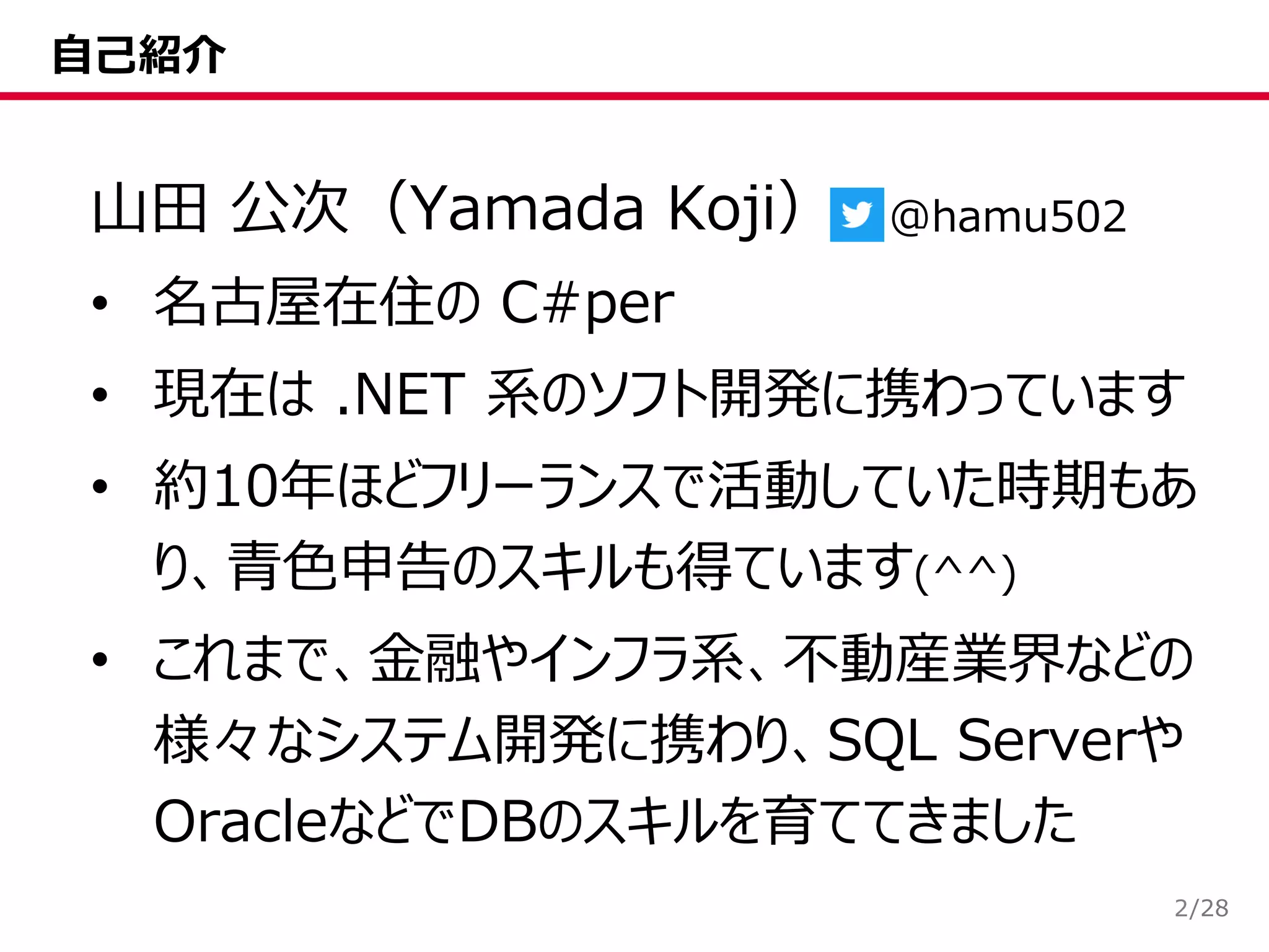 名古屋在住の C#per • 現在は .NET 系のソフト開発に携わっています • 約10年ほどフリーランスで活動していた時期もあ り、青色申告のスキルも得ています(^^) • これまで、金融やインフラ系、不動産業界などの 様々なシステム開発に携わり、SQL Serverや OracleなどでDBのスキルを育ててきました 2 @hamu502