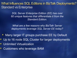 The document outlines the benefits and features of SQL Server 2008 in enhancing BizTalk 2009 projects, including aspects like cost savings, high availability, and performance improvements. It emphasizes the advantages of using the enterprise edition over the standard edition, such as scalability, security, and support for complex integration scenarios. The document also discusses deployment architecture considerations and specific case studies demonstrating the effectiveness of advanced SQL Server functionalities.