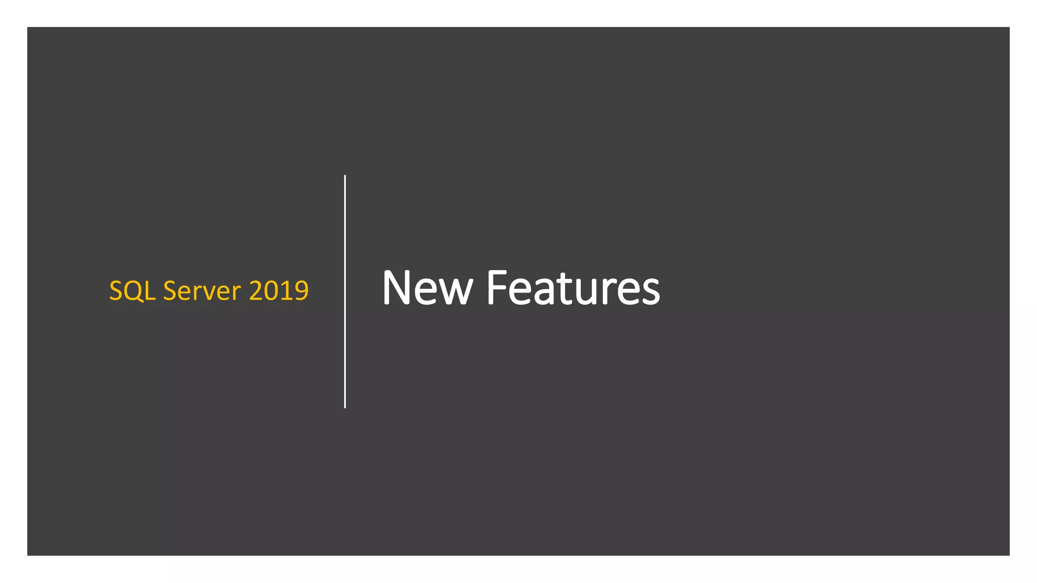 SQL Server 2019 introduces several new high availability and disaster recovery features such as support for up to 5 synchronous replicas in an Always On availability group and improved connection redirection capabilities. It also enhances PolyBase integration and provides new options for certificate management across instances. Additional new features include support for persistent memory, columnstore index improvements, and resumable online index operations.