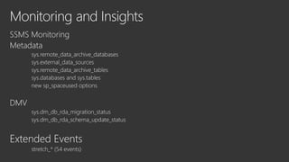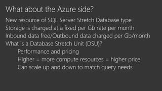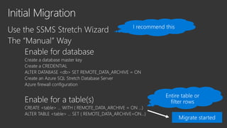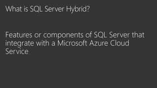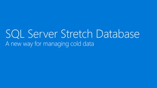 This document discusses Microsoft's SQL Server and its capabilities for developing and deploying across on-premises and cloud environments with a single consistent data platform. It highlights tools for backup, availability, encryption, and querying external storage in Microsoft Azure. SQL Server Stretch Database is described as a hybrid solution that securely migrates cold data to Azure while allowing remote query processing with applications continuing to use the on-premises database. The Database Migration Assistant is also mentioned as a tool.