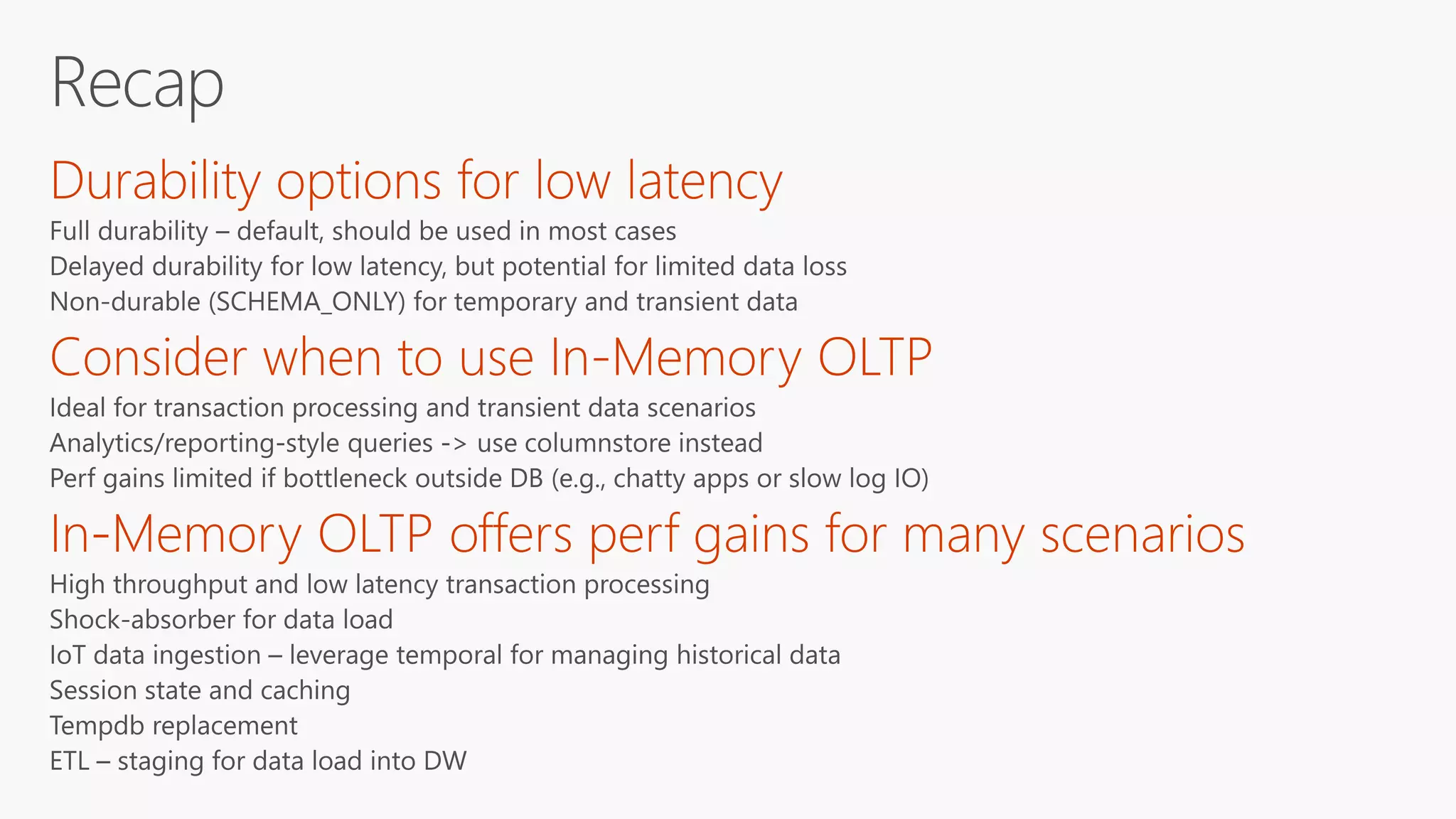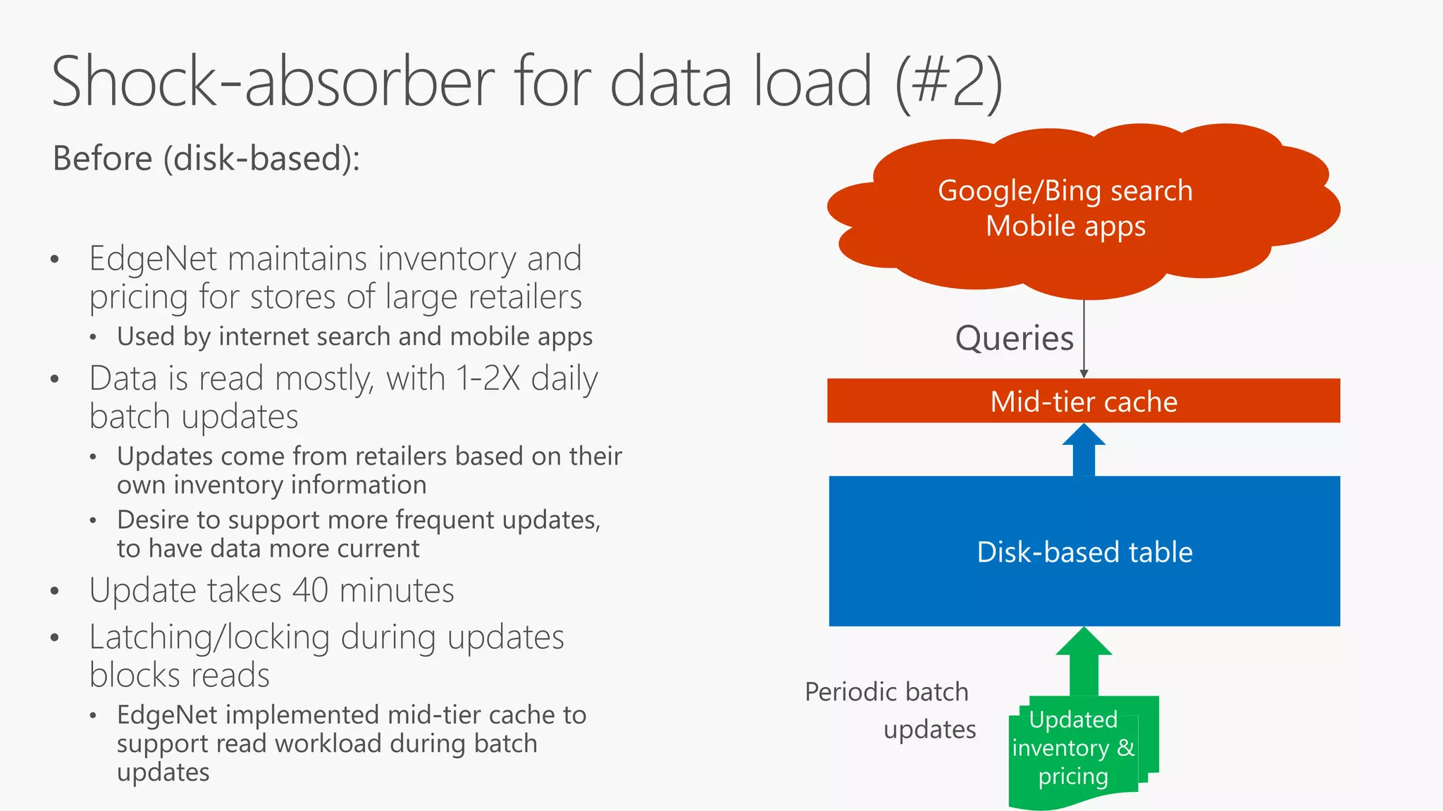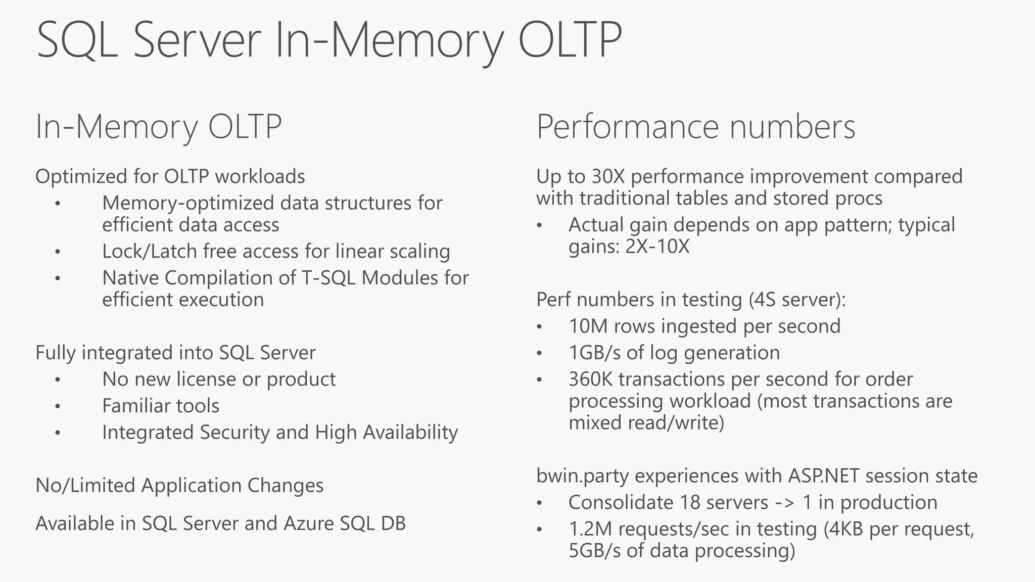 The document discusses performance improvements in different versions of SQL Server using in-memory OLTP technologies. SQL Server 2012 saw 12,000 batch requests/second limited by latch contention. SQL Server 2014 improved to 300,000 requests/second using memory-optimized tables but was still CPU-bound. SQL Server 2016 achieved 1,200,000 requests/second using memory-optimized tables with LOB support and natively compiled stored procedures. A production system at Bwin saw similar performance gains moving from a 19-node caching solution to a single SQL Server 2016 node.