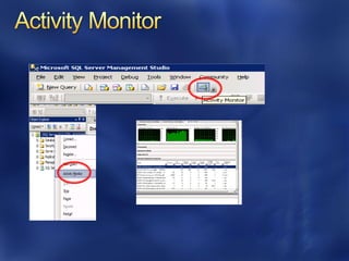 The document outlines strategies for troubleshooting performance problems in SQL Server 2008, focusing on key areas such as database performance tuning tools, bottleneck analysis, and specific performance metrics for CPU, memory, and I/O. It details various monitoring tools and techniques for identifying and resolving performance issues, while emphasizing the importance of iterative tuning and correlation of data points. Additionally, it highlights the significance of efficient query plans, resource governor configurations, and hardware upgrades in improving SQL Server performance.
