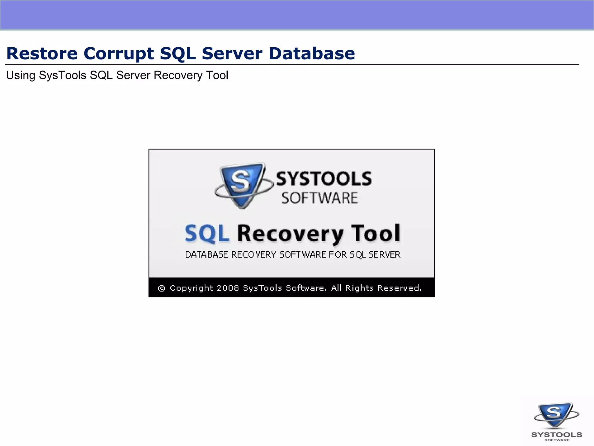 The document discusses the Systools SQL Server Recovery Tool, designed to recover corrupt SQL Server databases (.mdf files). It outlines common causes of database corruption, features of the recovery tool, and a step-by-step process for scanning, verifying, and restoring databases. The tool supports various SQL Server versions and offers various export options for recovered data.