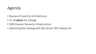 The document outlines best practices for disaster recovery and high availability for SQL Server Reporting Services (SSRS). It covers infrastructure components, catalog optimization, and performance considerations, emphasizing the importance of dedicated servers and disk configurations. Additionally, it details disaster recovery configurations, failover scenarios, and the use of asynchronous mirroring for maintaining report metadata in different environments.