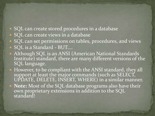SQL is a standard language for accessing and manipulating relational databases. It allows users to define, manipulate, and control access to data in a database. Some key capabilities of SQL include executing queries to retrieve data, as well as inserting, updating, and deleting records. SQL databases typically contain tables made up of rows and columns that store data. Relationships between tables are defined through primary and foreign keys. Database management systems use SQL to maintain database objects like tables, indexes, and views.