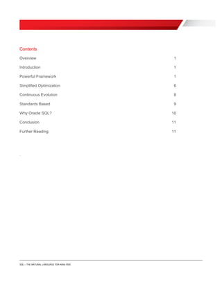 This document discusses why SQL has endured as the dominant language for data analysis for over 40 years. SQL provides a powerful yet simple framework for querying data through its use of relational algebra concepts like projection, filtering, joining, and aggregation. It also allows for transparent optimization by the database as SQL is declarative rather than procedural. Additionally, SQL has continuously evolved through standards while providing access to a wide variety of data sources.