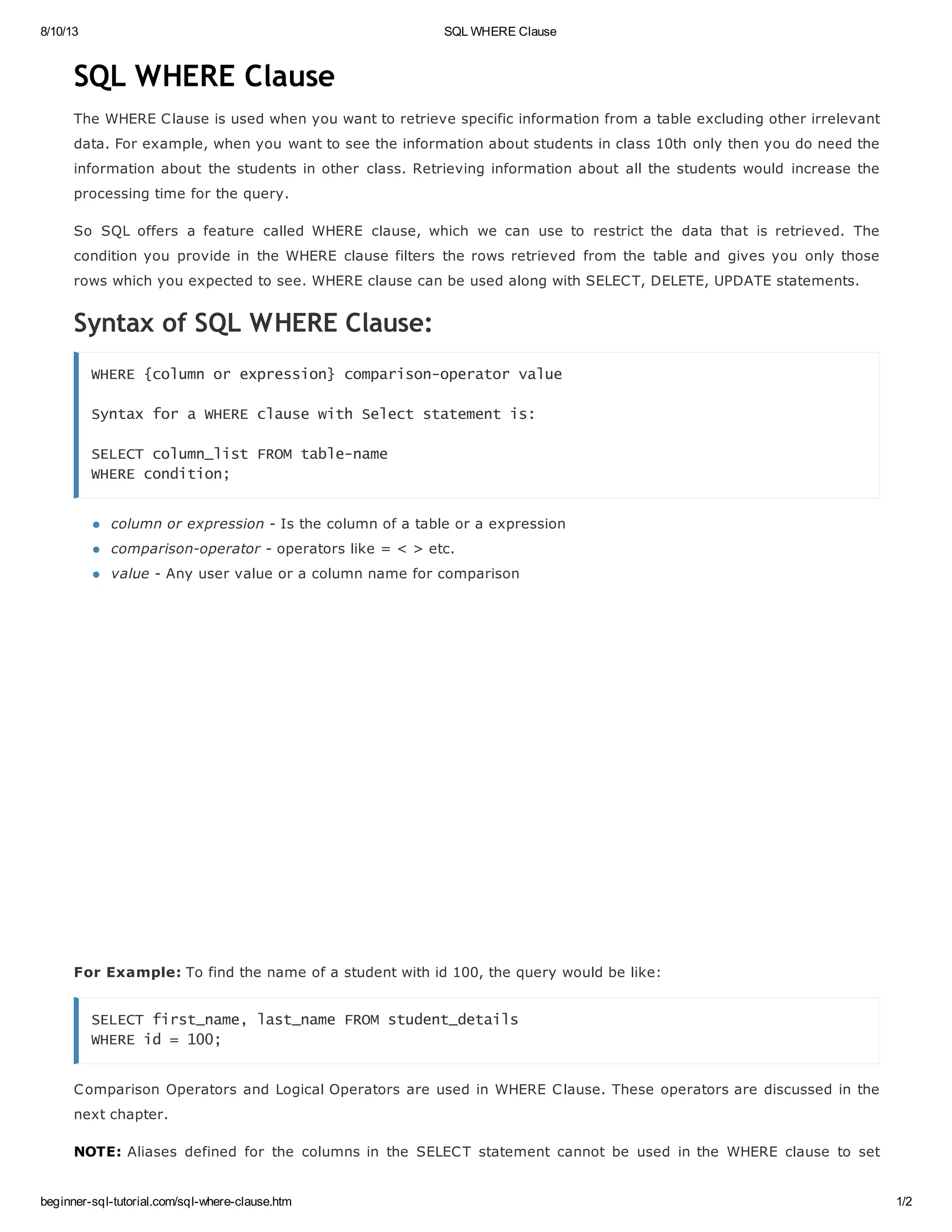 The WHERE clause is used to filter rows retrieved from a table and return only rows that meet specific conditions. The condition in the WHERE clause uses comparison operators to compare column values to literals or other column values. Expressions can also be used in the WHERE clause. Examples demonstrate retrieving a student's name by ID and calculating a salary increase over a threshold.