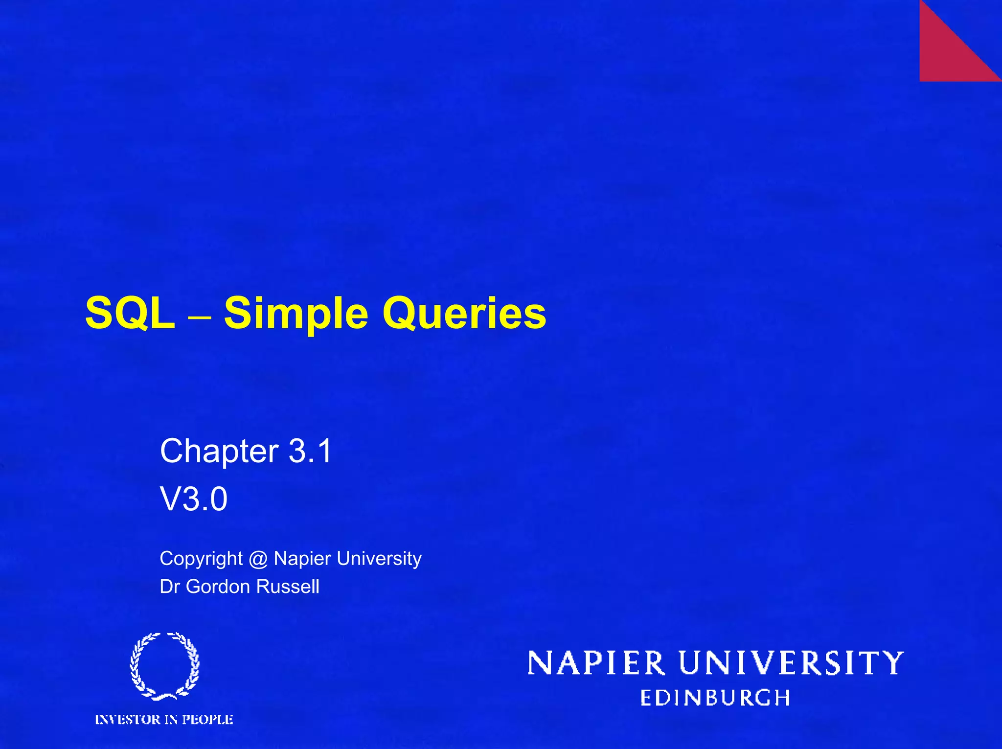 SQL is a language used to interact with database management systems (DBMS) and query relational databases. It allows users to create, modify, and access data in databases. The document provides an overview of SQL and relational database concepts like relational data structure, domains, primary keys, and referential integrity. It also demonstrates basic SQL queries using the SELECT statement to retrieve data from example CAR and DRIVER tables. Operators like WHERE, BETWEEN, LIKE, NULL, and comparisons are discussed to filter query results based on conditions.