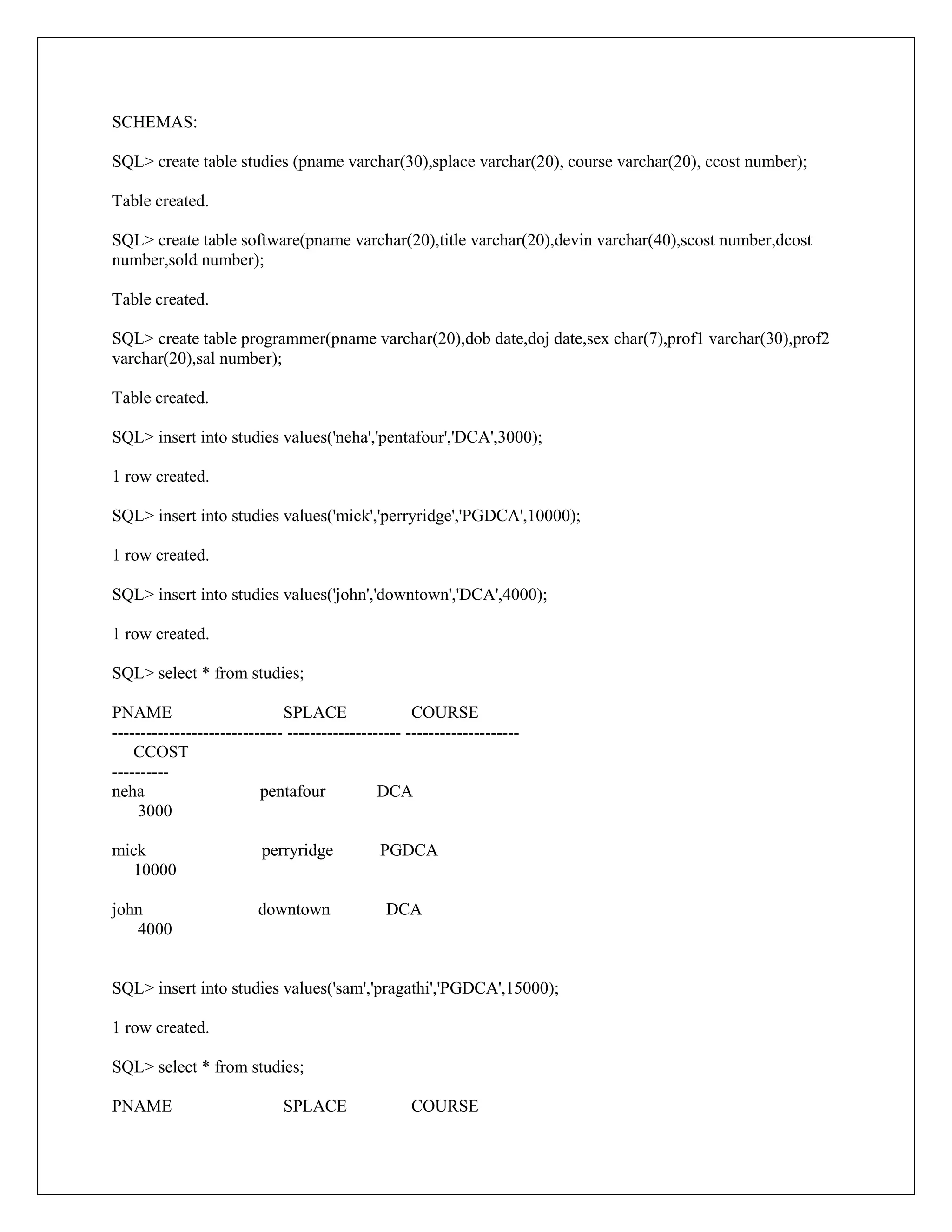 The document contains SQL commands that create tables, insert data, and perform queries on the tables. The tables created are studies, software, and programmer. Data is inserted and various queries are run to retrieve, aggregate, and analyze the data. Key information summarized includes: