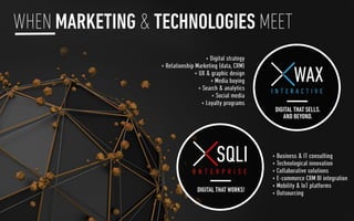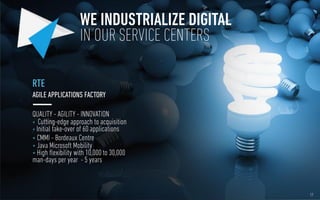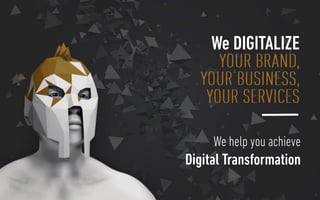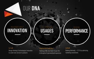 This document discusses digital performance and brands as well as having a lab and following experts. It mentions expertise in complex innovative projects and working with a partner to assist with those projects. The document recommends following experts who can help with digital performance and innovation.