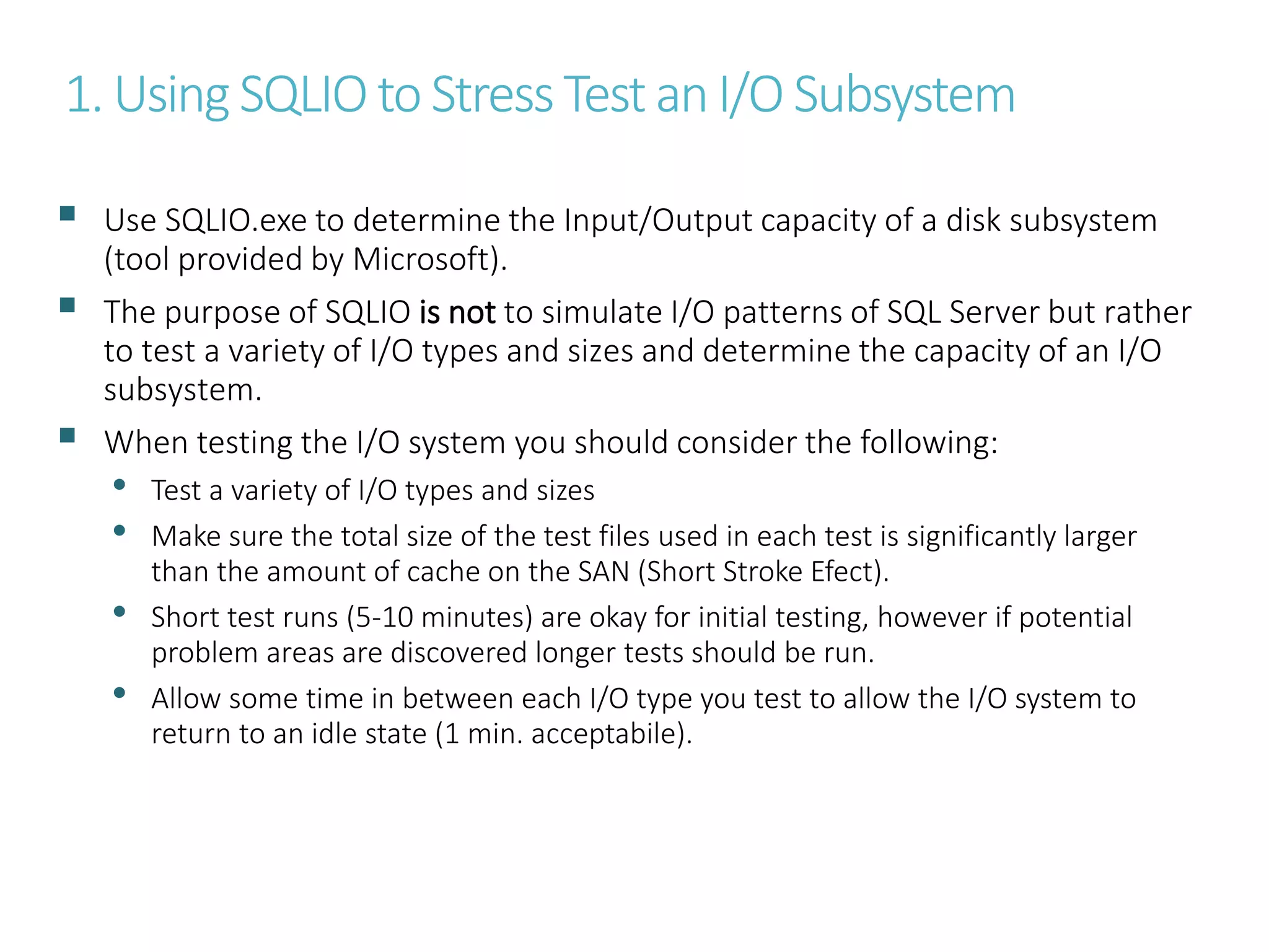 The document discusses using SQLIO to test the input/output capacity of a disk subsystem. It provides guidance on running SQLIO tests with different I/O types, sizes, and durations. The document also discusses interpreting SQLIO results and monitoring I/O performance using Windows Performance Monitor and Resource Monitor. Key factors that influence I/O performance like outstanding I/Os, queue depth, throughput, and latency are explained.
