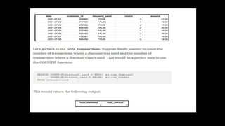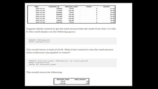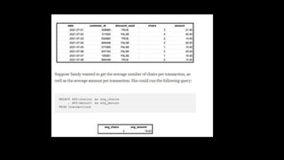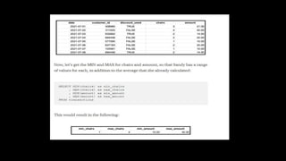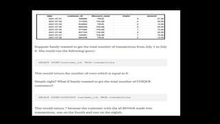 This document provides an overview of SQL including basics, advanced topics, exercises, and common interview questions. It begins with definitions of SQL, databases, and relational schemas. Key concepts covered include data definition language, data manipulation language, data control language, constraints, aggregate functions, analytical functions, and ranking functions. Examples of SQL queries are provided for common interview questions such as retrieving the second highest salary or finding duplicate emails. Links to additional SQL interview questions and tutorials are listed at the end.
