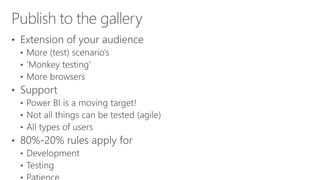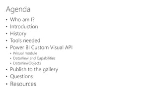 The document contains contact information for an individual and links to various resources related to Power BI custom visual development including GitHub repositories for visuals and tools, documentation, and links to download necessary software like Node.js, Visual Studio Code, and a Visual Studio Code extension. It also mentions a demo and asks if there are any questions.