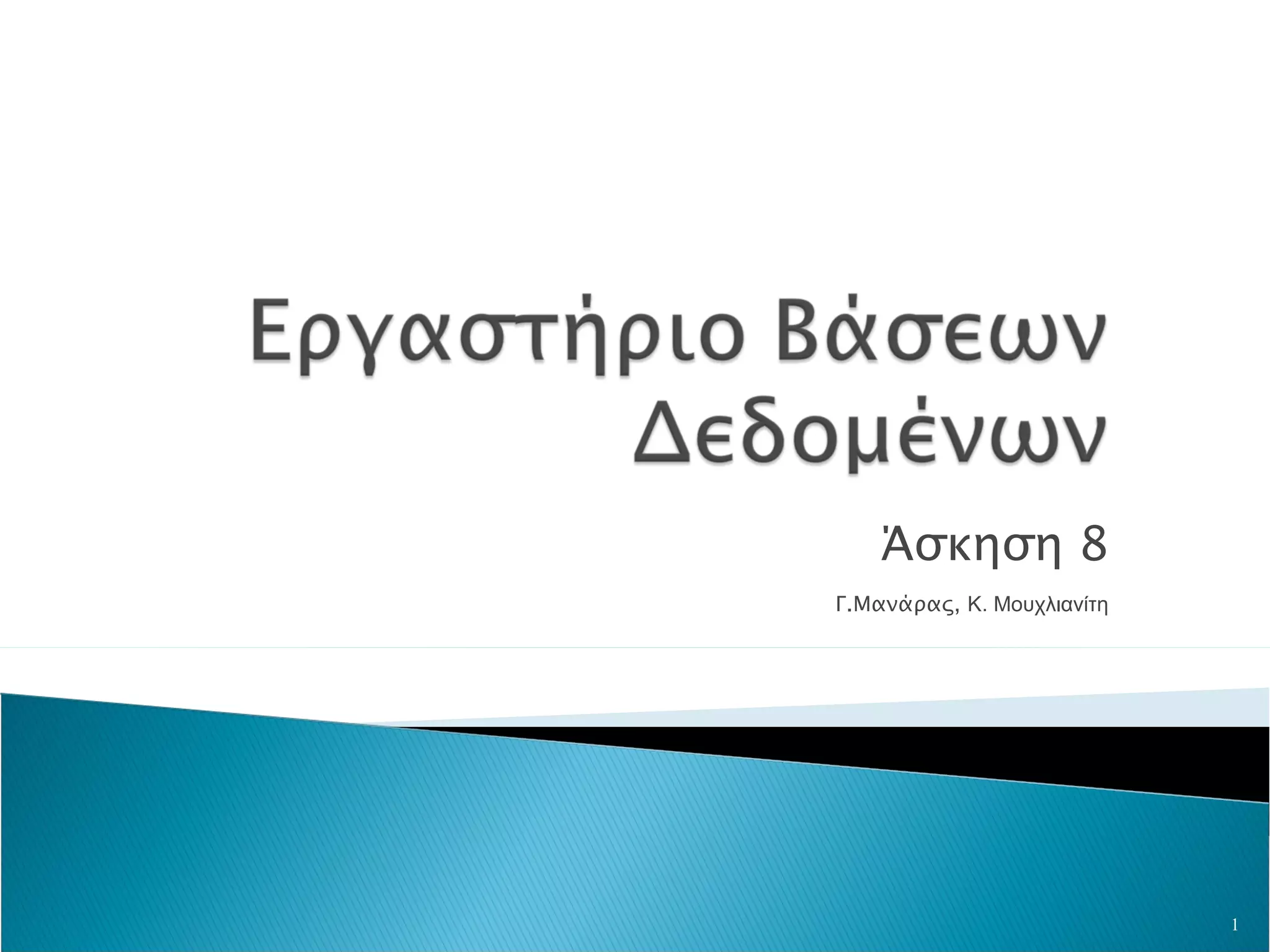 Μπορούμε να δώσουμεένα ψευδώνυμο (alias) σε ένα πίνακα με τον ίδιο τρόπο που δίνουμε και σε μία στήλη : select column_name1, column_name2,… from table_name1 as alias1, table_name2 as alias2 where alias1.column_name3 = alias2.column_name3; select * from school as S, dept as D where S.scid = D.scid; select S.name as SCHOOL, D.name as DEPARTMENT from school as S, dept as D where S.scid = D.scid;