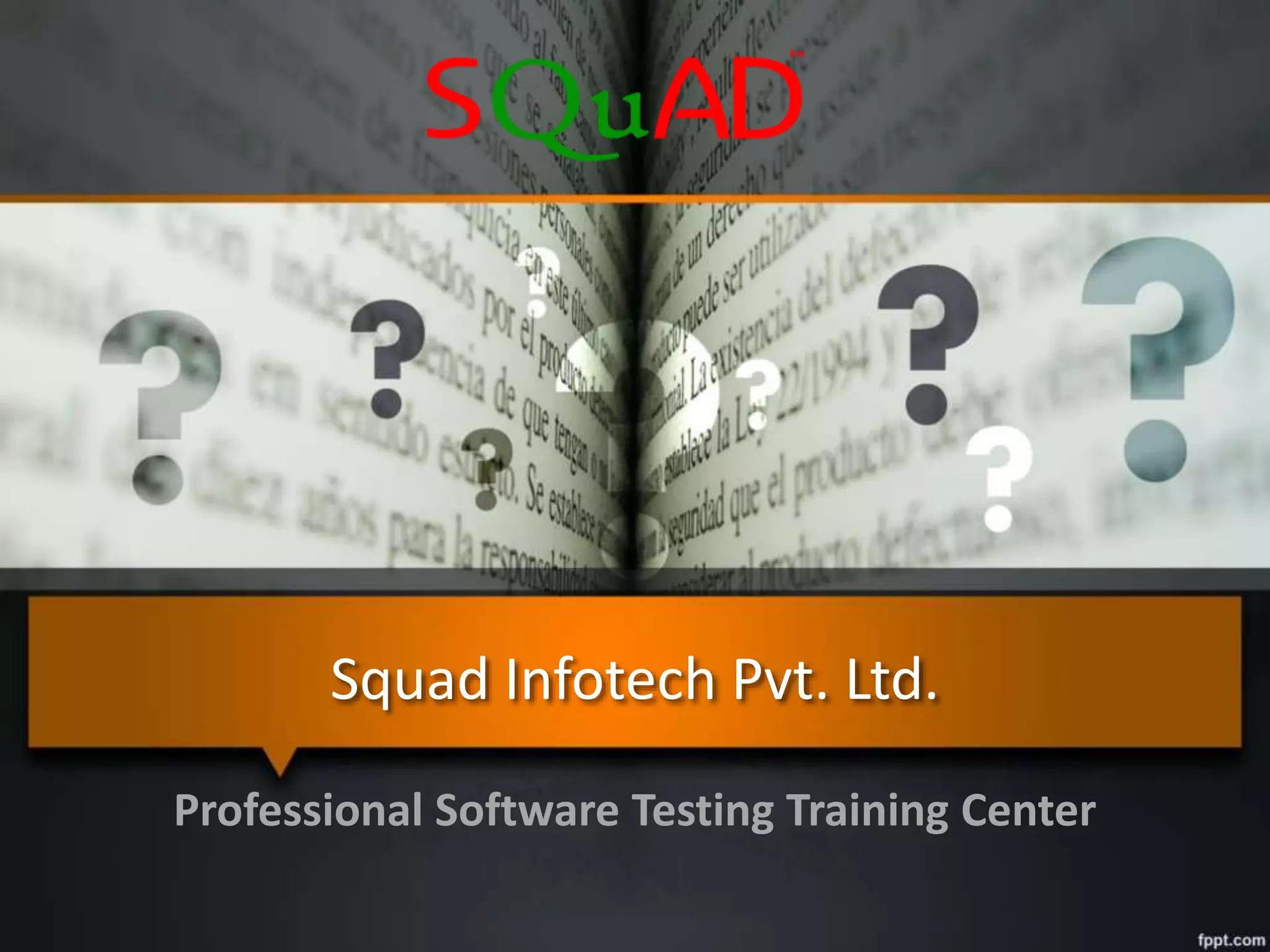 Squad Infotech Pvt. Ltd. is a professional software testing training center with over 12 years of IT experience, offering career-oriented training-cum-placement programs and a commitment to making the nation employable. They provide extensive programs including job guarantees and ISTQB certification, along with a strong track record of placements. Additionally, Squad serves to bridge educational institutions with industry requirements and offers workshops in management development for various sectors.